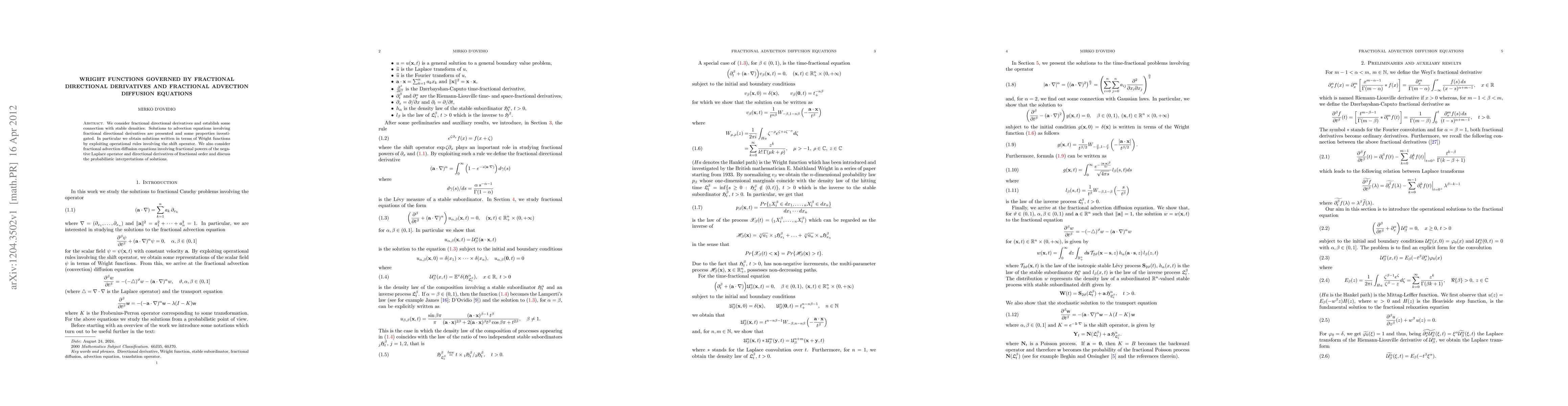 This paper explores fractional directional derivatives and their connection to stable densities, presenting solutions to advection equations using Wright functions. It also investigates fractional advection diffusion equations, discussing probabilistic interpretations of the solutions.