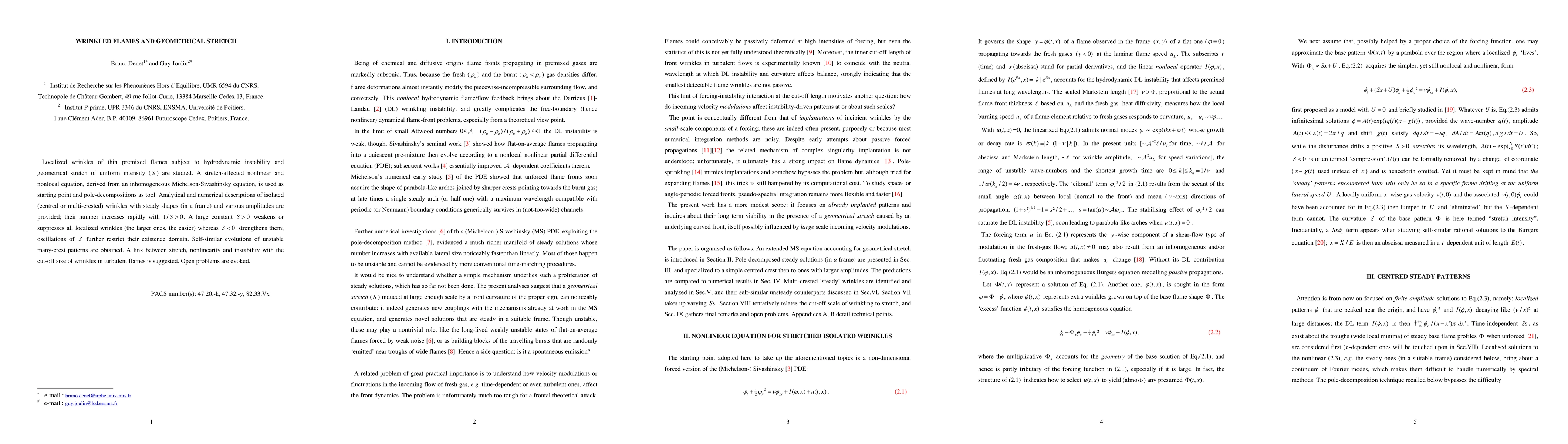 Localized wrinkles of thin premixed flames subject to hydrodynamic instability and geometrical stretch of uniform intensity (S) are studied. A stretch-affected nonlinear and nonlocal equation, derived from an inhomogeneous Michelson-Sivashinsky equation, is used as a starting point, and pole decompositions are used as a tool. Analytical and numerical descriptions of isolated (centered or multicrested) wrinkles with steady shapes (in a frame) and various amplitudes are provided; their number increases rapidly with 1/S > 0. A large constantS > 0 weakens or suppresses all localized wrinkles (the larger the wrinkles, the easier the suppression), whereasS < 0 strengthens them; oscillations of S further restrict their existence domain. Self-similar evolutions of unstable many-crested patterns are obtained. A link between stretch, nonlinearity, and instability with the cutoff size of the wrinkles in turbulent flames is suggested. Open problems are evoked.