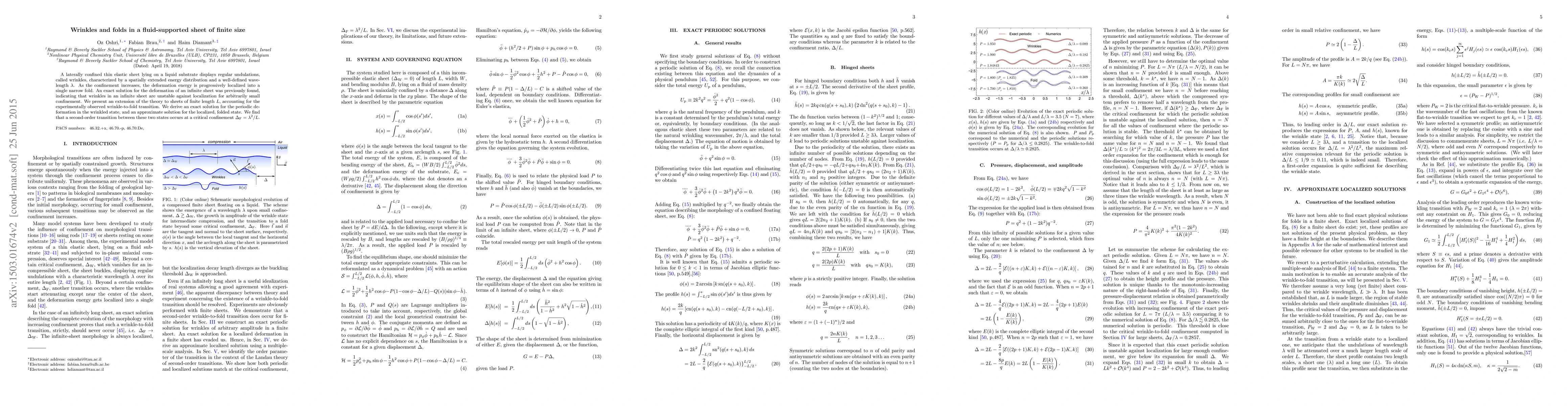 A laterally confined thin elastic sheet lying on a liquid substrate displays regular undulations, called wrinkles, characterized by a spatially extended energy distribution and a well-defined wavelength $\lambda$. As the confinement increases, the deformation energy is progressively localized into a single narrow fold. An exact solution for the deformation of an infinite sheet was previously found, indicating that wrinkles in an infinite sheet are unstable against localization for arbitrarily small confinement. We present an extension of the theory to sheets of finite length $L$, accounting for the experimentally observed wrinkle-to-fold transition. We derive an exact solution for the periodic deformation in the wrinkled state, and an approximate solution for the localized, folded state. We show that a second-order transition between these two states occurs at a critical confinement $\Delta_F=\lambda^2/L$.