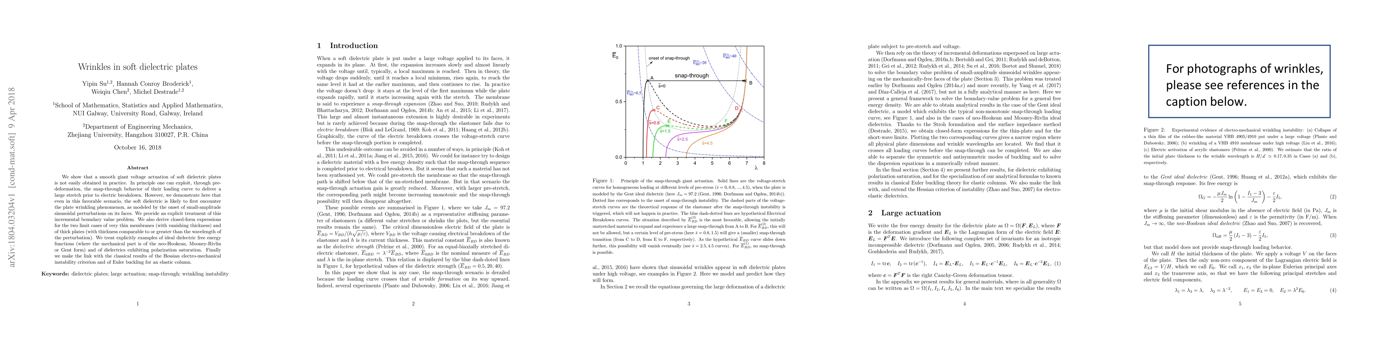 This paper explores the wrinkling phenomenon in soft dielectric plates under electric actuation, demonstrating that despite pre-deformation strategies, plates are prone to wrinkling before achieving large stretches due to electric breakdown. It provides closed-form expressions for thin and thick plates and links the findings to electro-mechanical instability and Euler buckling.