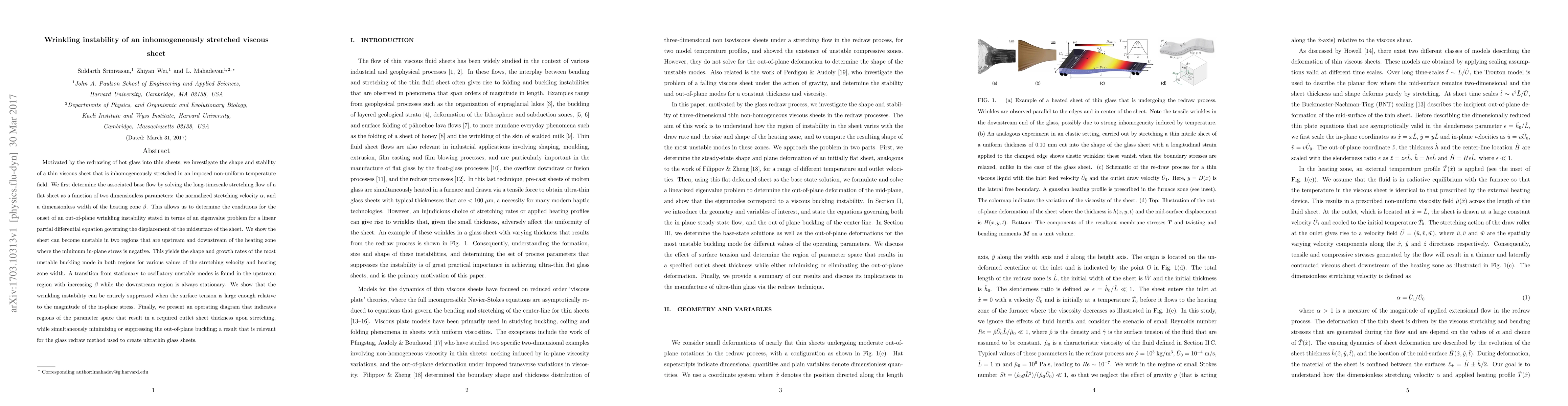 This paper investigates the wrinkling instability of an inhomogeneously stretched viscous sheet, determining conditions for out-of-plane buckling in non-uniform temperature fields. It finds the sheet can become unstable upstream and downstream of the heating zone, with a transition from stationary to oscillatory modes, and shows that high surface tension can suppress the instability.