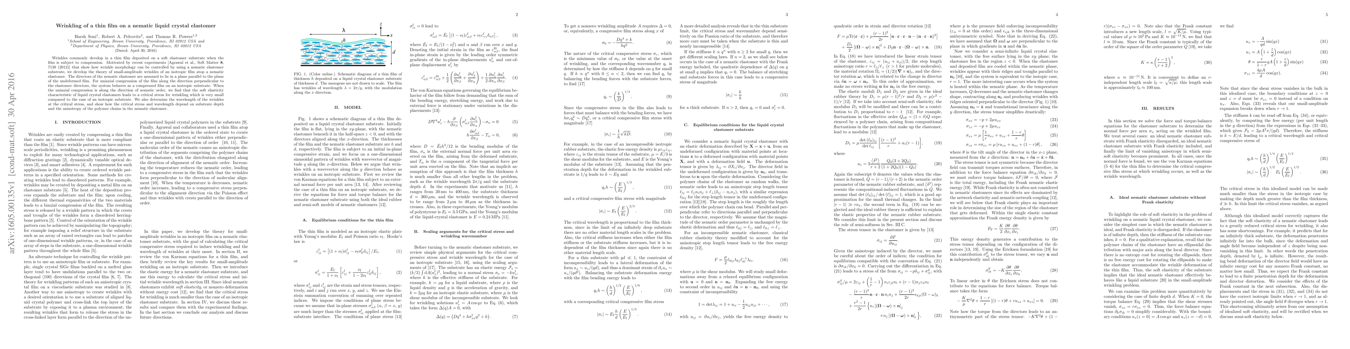 This paper develops a theoretical framework to understand the formation of small-amplitude wrinkles in a thin film on a nematic liquid crystal elastomer substrate, showing that the critical stress for wrinkling is significantly lower than in isotropic substrates due to the soft elasticity of the liquid crystal elastomer, and analyzes how substrate depth and polymer chain anisotropy influence the critical stress and wrinkle wavelength.