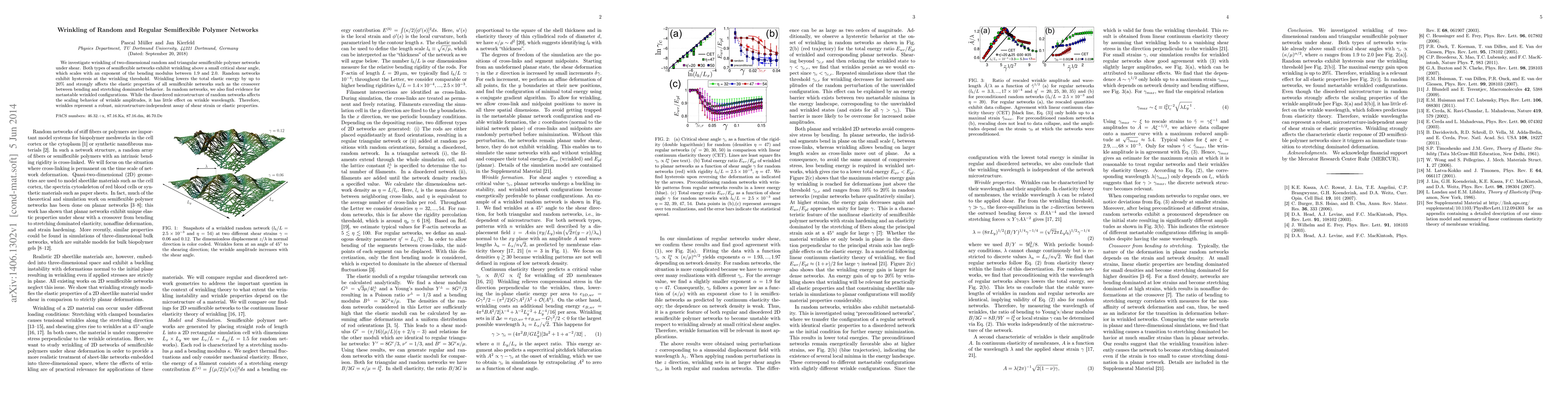 This paper explores the wrinkling behavior of two-dimensional random and regular semiflexible polymer networks under shear, finding that both types exhibit wrinkling above a critical shear angle, with scaling exponents between 1.9 and 2.0. Wrinkling reduces elastic energy and influences the material's elastic properties, with random networks showing hysteresis and metastable configurations.