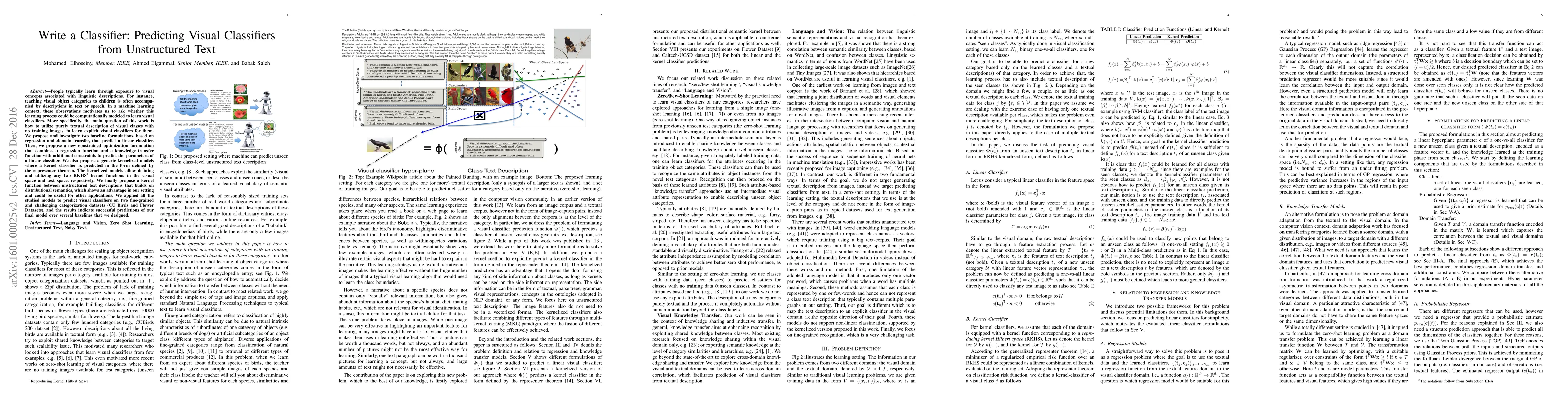This paper proposes methods to predict visual classifiers from unstructured text descriptions without using training images. It introduces baseline regression and domain transfer models, a constrained optimization formulation, and kernelized models, demonstrating successful predictions on fine-grained categorization datasets like CU Birds and Flower Datasets.