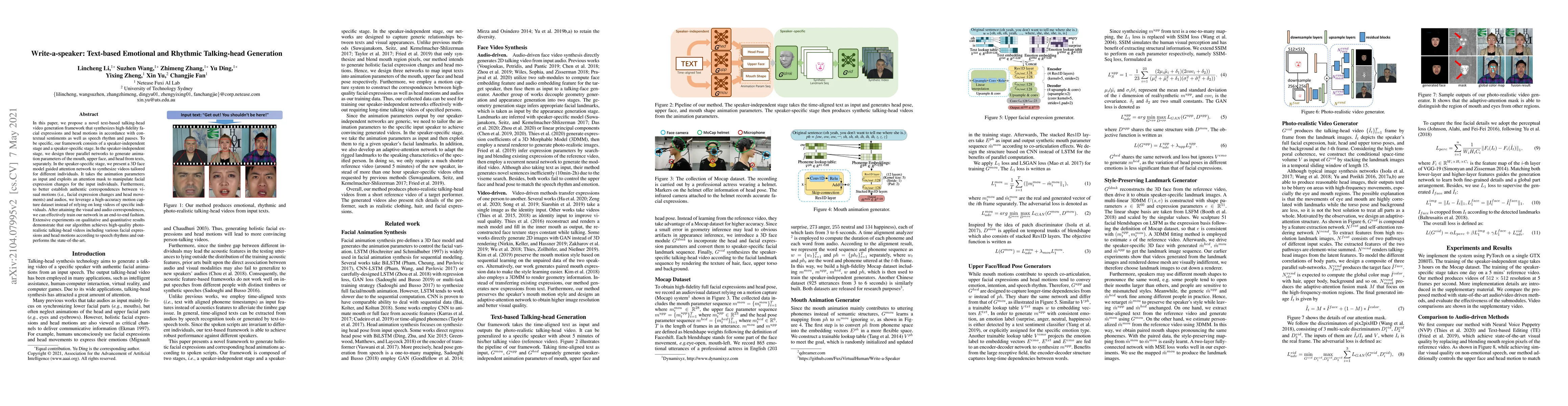 This paper introduces a framework for generating text-based talking-head videos that accurately reflect emotional and rhythmic speech through a combination of speaker-independent and speaker-specific stages, achieving high-fidelity facial expressions and head motions. The method leverages a high-accuracy motion capture dataset for training, resulting in photo-realistic videos that outperform existing techniques.