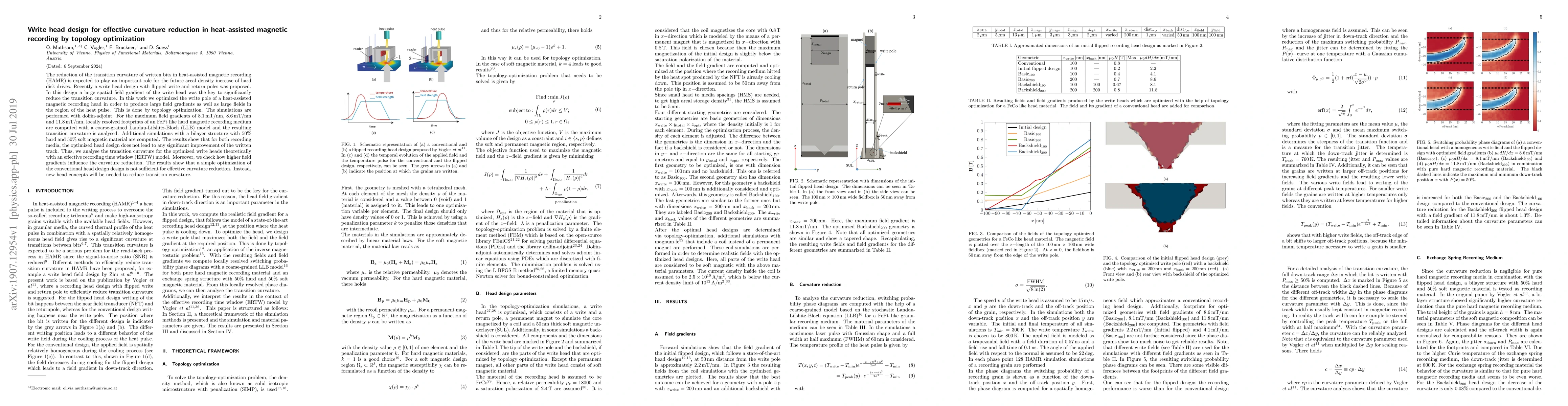 This research optimizes the design of write heads for heat-assisted magnetic recording (HAMR) using topology optimization to achieve large field gradients and reduce bit transition curvature. Despite achieving high field gradients, the optimized head design did not significantly improve written track quality, indicating that new head concepts are necessary for effective curvature reduction.
