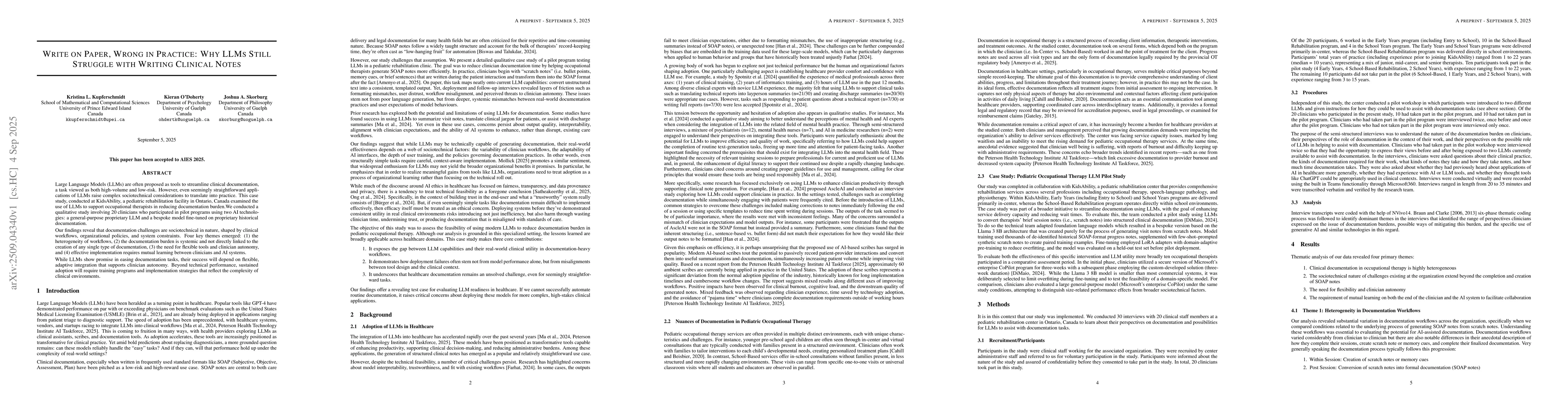Large Language Models (LLMs) are often proposed as tools to streamline clinical documentation, a task viewed as both high-volume and low-risk. However, even seemingly straightforward applications of LLMs raise complex sociotechnical considerations to translate into practice. This case study, conducted at KidsAbility, a pediatric rehabilitation facility in Ontario, Canada examined the use of LLMs to support occupational therapists in reducing documentation burden.We conducted a qualitative study involving 20 clinicians who participated in pilot programs using two AI technologies: a general-purpose proprietary LLM and a bespoke model fine-tuned on proprietary historical documentation. Our findings reveal that documentation challenges are sociotechnical in nature, shaped by clinical workflows, organizational policies, and system constraints. Four key themes emerged: (1) the heterogeneity of workflows, (2) the documentation burden is systemic and not directly linked to the creation of any single type of documentation, (3) the need for flexible tools and clinician autonomy, and (4) effective implementation requires mutual learning between clinicians and AI systems. While LLMs show promise in easing documentation tasks, their success will depend on flexible, adaptive integration that supports clinician autonomy. Beyond technical performance, sustained adoption will require training programs and implementation strategies that reflect the complexity of clinical environments.