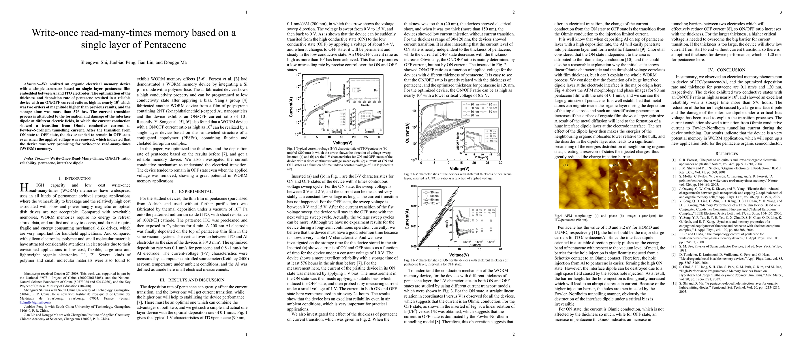 We realized an organic electrical memory device with a simple structure based on single layer pentacene film embedded between Al and ITO electrodes. The optimization of the thickness and deposition rate of pentacene resulted in a reliable device with an ON/OFF current ratio as high as nearly 1000000 which was two orders of magnitude higher than previous results, and the storage time was more than 576 hrs. The current transition process is attributed to the formation and damage of the interface dipole at different electric fields, in which the current conduction showed a transition from Ohmic conductive current to Fowler?Nordheim tunnelling current. After the transition from ON state to OFF state, the device tended to remain in OFF state even when the applied voltage was removed, which indicated that the device was very promising for write-once read-many-times (WORM) memory.