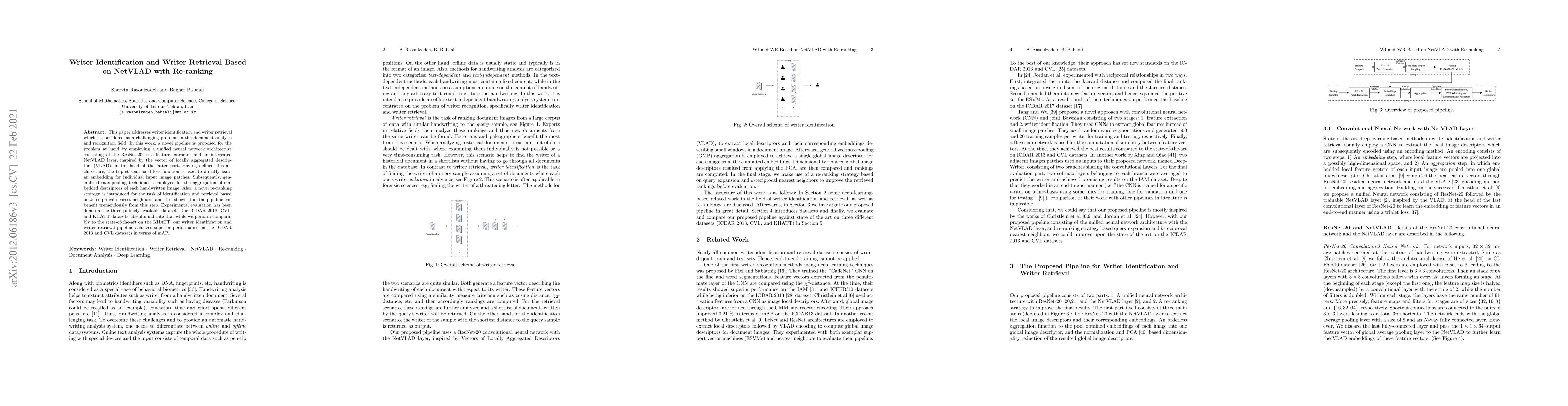 This paper proposes a novel neural network for writer identification and retrieval using a ResNet-20 feature extractor with a NetVLAD layer and a re-ranking strategy based on $k$-reciprocal nearest neighbors, achieving superior performance on ICDAR 2013 and CVL datasets compared to state-of-the-art methods.