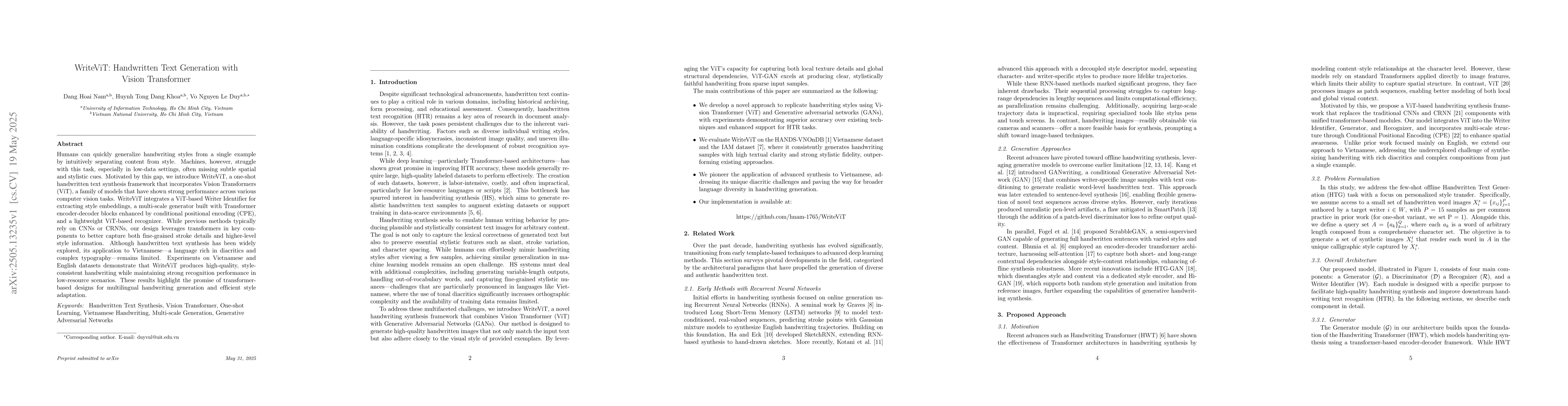 This research highlights the promise of transformer-based designs for multilingual handwriting generation and efficient style adaptation, particularly for languages with complex typography like Vietnamese.