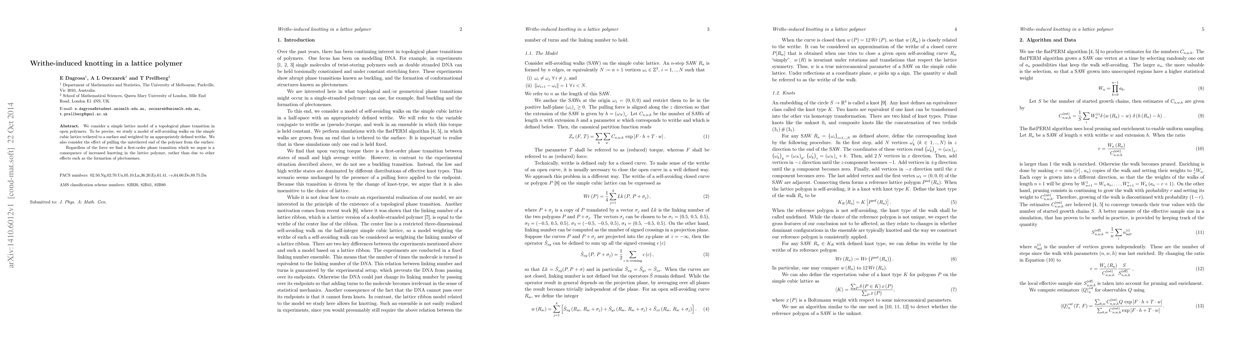 We consider a simple lattice model of a topological phase transition in open polymers. To be precise, we study a model of self-avoiding walks on the simple cubic lattice tethered to a surface and weighted by an appropriately defined writhe. We also consider the effect of pulling the untethered end of the polymer from the surface. Regardless of the force we find a first-order phase transition which we argue is a consequence of increased knotting in the lattice polymer, rather than due to other effects such as the formation of plectonemes.