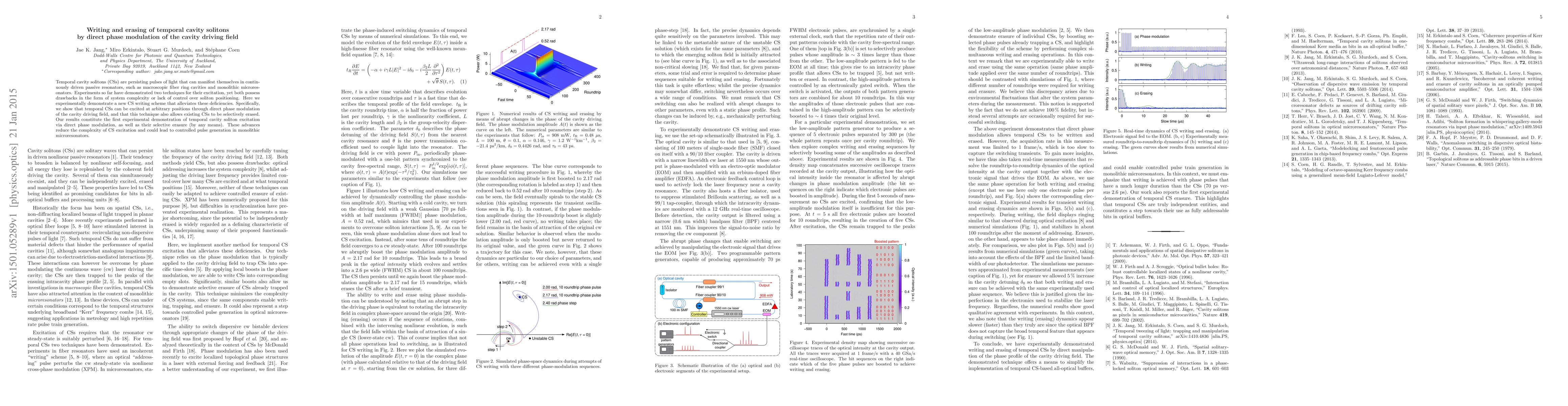 This paper demonstrates a novel method for writing and erasing temporal cavity solitons by directly modulating the phase of the cavity driving field, allowing for precise control over soliton positioning and reducing system complexity. This technique enables the selective excitation of solitons at arbitrary locations and their erasure, paving the way for advanced pulse generation in microresonators.