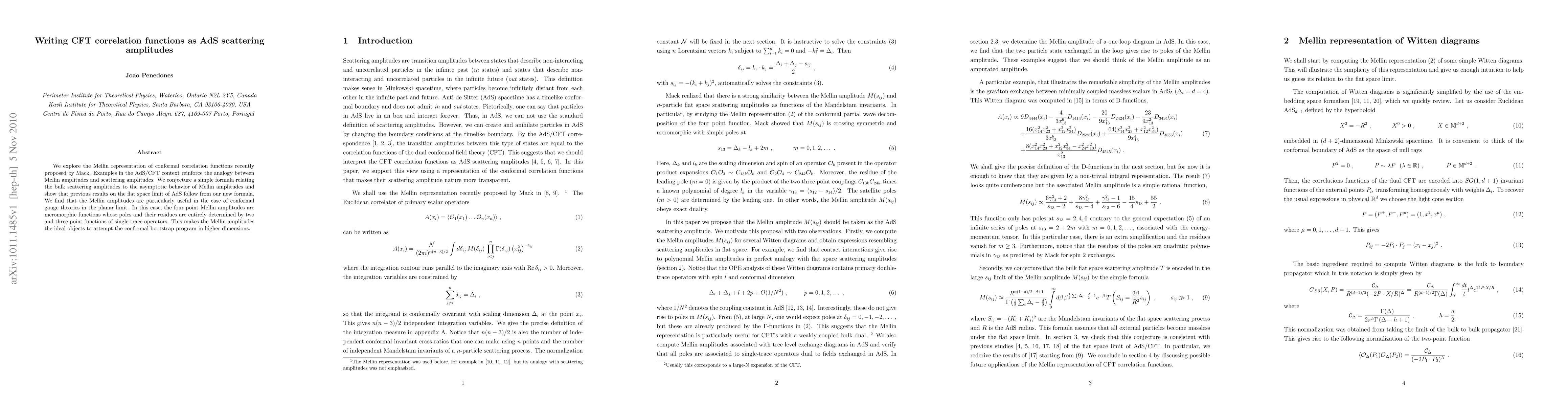 This paper proposes a Mellin representation for conformal field theory (CFT) correlation functions, drawing a parallel to AdS scattering amplitudes. It conjectures a formula linking bulk scattering to the asymptotic behavior of Mellin amplitudes, demonstrating its utility in the conformal bootstrap program for higher-dimensional conformal gauge theories.