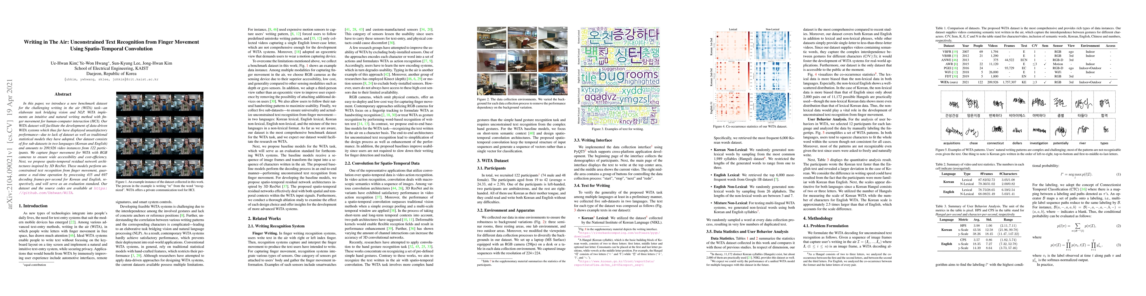 This paper introduces a new dataset for unconstrained text recognition from finger movements in the air, termed Writing in The Air (WiTA). The authors propose spatio-temporal convolutional networks inspired by 3D ResNet for real-time text recognition, achieving high frame rates for both Korean and English.