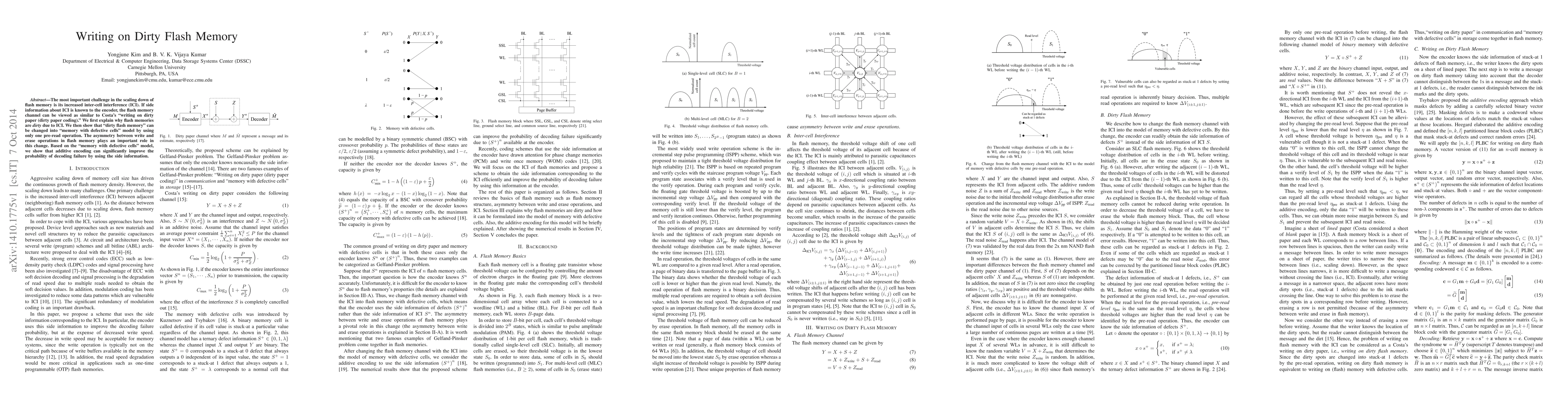 This paper explores the challenge of inter-cell interference in scaled-down flash memory, likening it to Costa's "writing on dirty paper" problem. It demonstrates that using side information about interference can transform the flash memory into a "memory with defective cells" model, significantly improving decoding success through additive encoding.