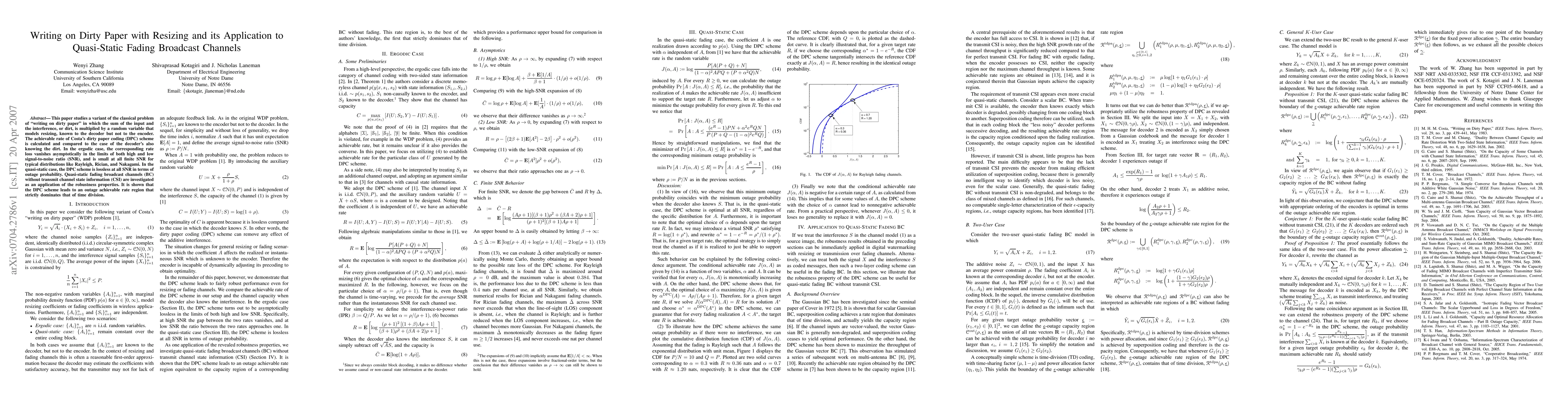 This paper explores a modified "writing on dirty paper" problem with resizing interference, analyzing the achievable rate of Costa's dirty paper coding scheme under different signal-to-noise ratios. It demonstrates that the scheme is robust and outperforms time division in quasi-static fading broadcast channels.