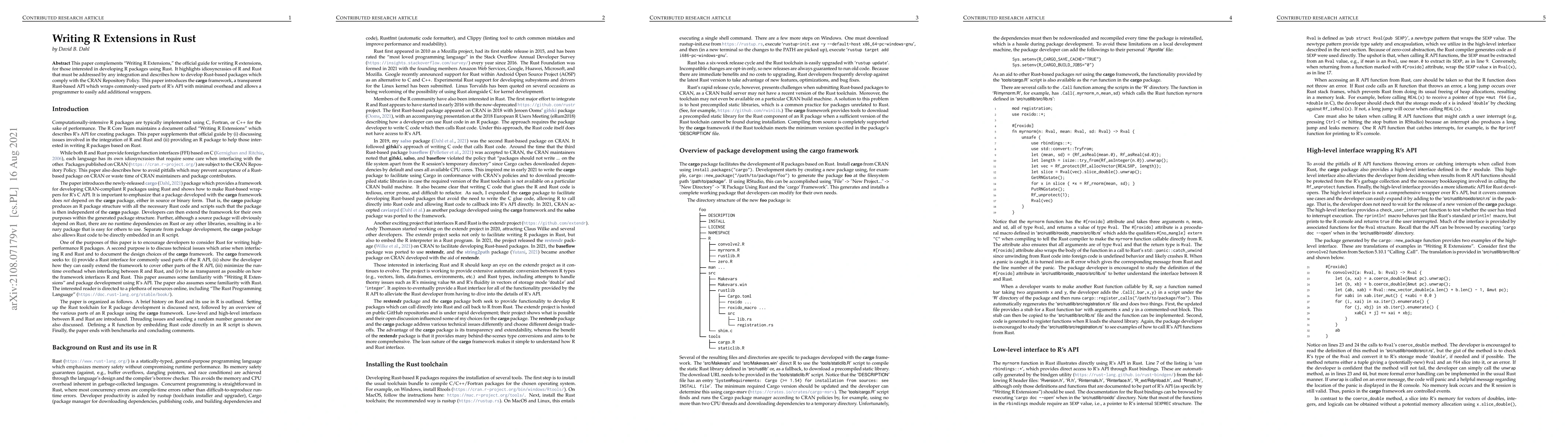 This paper provides guidance for developing R packages using Rust, addressing integration challenges and compliance with CRAN policies. It introduces the "cargo" framework, a Rust-based API that simplifies wrapping R's API with minimal overhead.