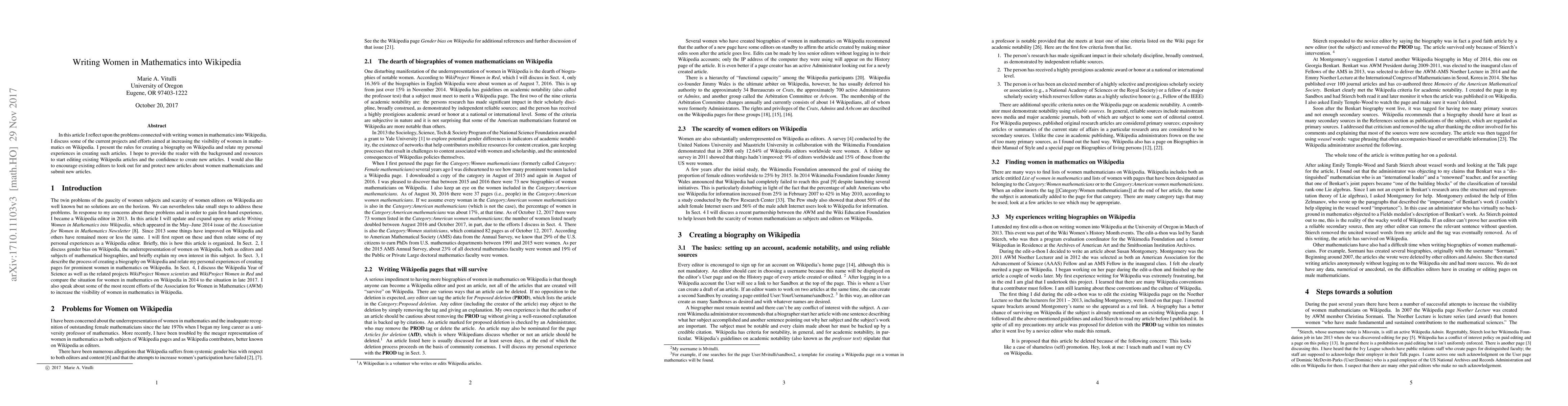 In this article I reflect upon the problems connected with writing women in mathematics into Wikipedia. I discuss some of the current projects and efforts aimed at increasing the visibility of women in mathematics on Wikipedia. I present the rules for creating a biography on Wikipedia and relate my personal experiences in creating such articles. I hope to provide the reader with the background and resources to start editing existing Wikipedia articles and the confidence to create new articles. I would also like to encourage existing editors to look out for and protect new articles about women mathematicians and submit new articles.
