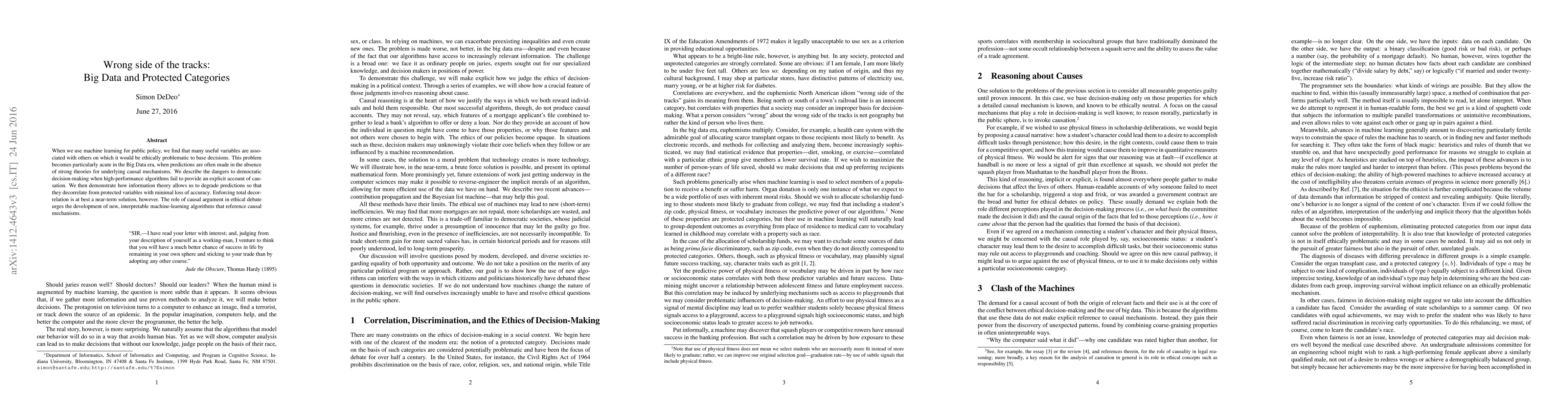 When we use machine learning for public policy, we find that many useful variables are associated with others on which it would be ethically problematic to base decisions. This problem becomes particularly acute in the Big Data era, when predictions are often made in the absence of strong theories for underlying causal mechanisms. We describe the dangers to democratic decision-making when high-performance algorithms fail to provide an explicit account of causation. We then demonstrate how information theory allows us to degrade predictions so that they decorrelate from protected variables with minimal loss of accuracy. Enforcing total decorrelation is at best a near-term solution, however. The role of causal argument in ethical debate urges the development of new, interpretable machine-learning algorithms that reference causal mechanisms.