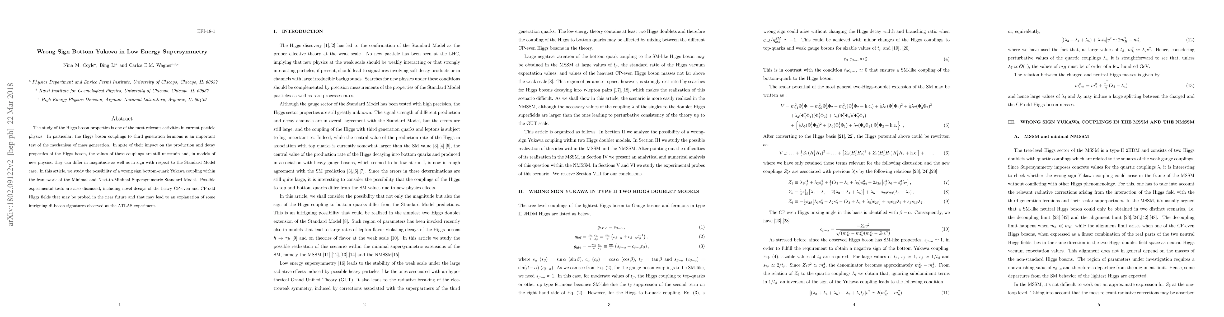 The study of the Higgs boson properties is one of the most relevant activities in current particle physics. In particular, the Higgs boson couplings to third generation fermions is an important test of the mechanism of mass generation. In spite of their impact on the production and decay properties of the Higgs boson, the values of these couplings are still uncertain and, in models of new physics, they can differ in magnitude as well as in sign with respect to the Standard Model case. In this article, we study the possibility of a wrong sign bottom-quark Yukawa coupling within the framework of the Minimal and Next-to-Minimal Supersymmetric Standard Model. Possible experimental tests are also discussed, including novel decays of the heavy CP-even and CP-odd Higgs fields that may be probed in the near future and that may lead to an explanation of some intriguing di-boson signatures observed at the ATLAS experiment.