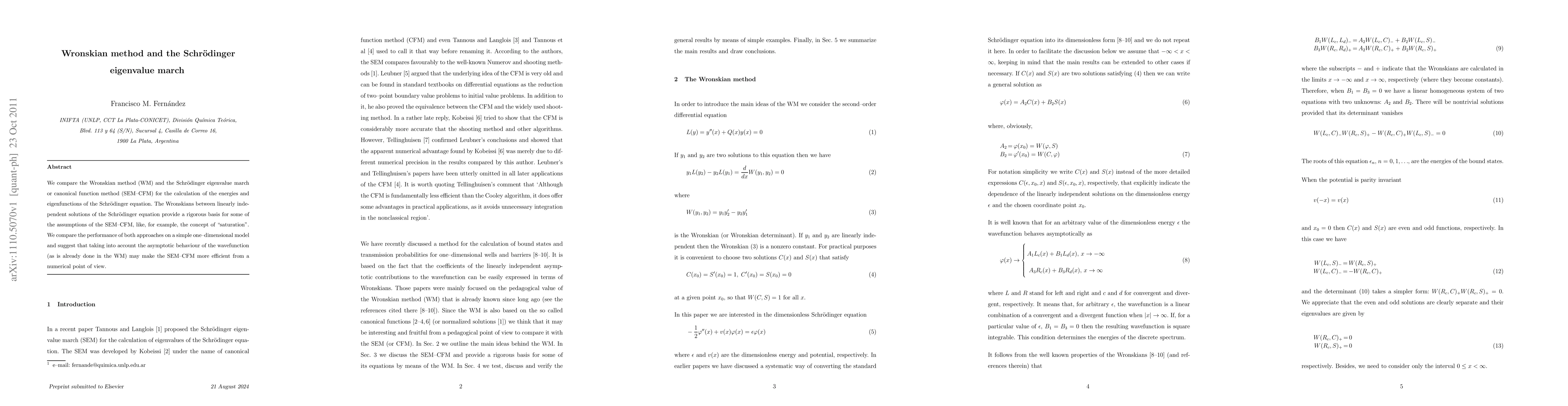 We compare the Wronskian method (WM) and the Schr\"odinger eigenvalue march or canonical function method (SEM--CFM) for the calculation of the energies and eigenfunctions of the Schr\"odinger equation. The Wronskians between linearly independent solutions of the Schr\"odinger equation provide a rigorous basis for some of the assumptions of the SEM-CFM, like, for example, the concept of "saturation". We compare the performance of both approaches on a simple one-dimensional model and suggest that taking into account the asymptotic behaviour of the wavefunction (as is already done in the WM) may make the SEM-CFM more efficient from a numerical point of view.