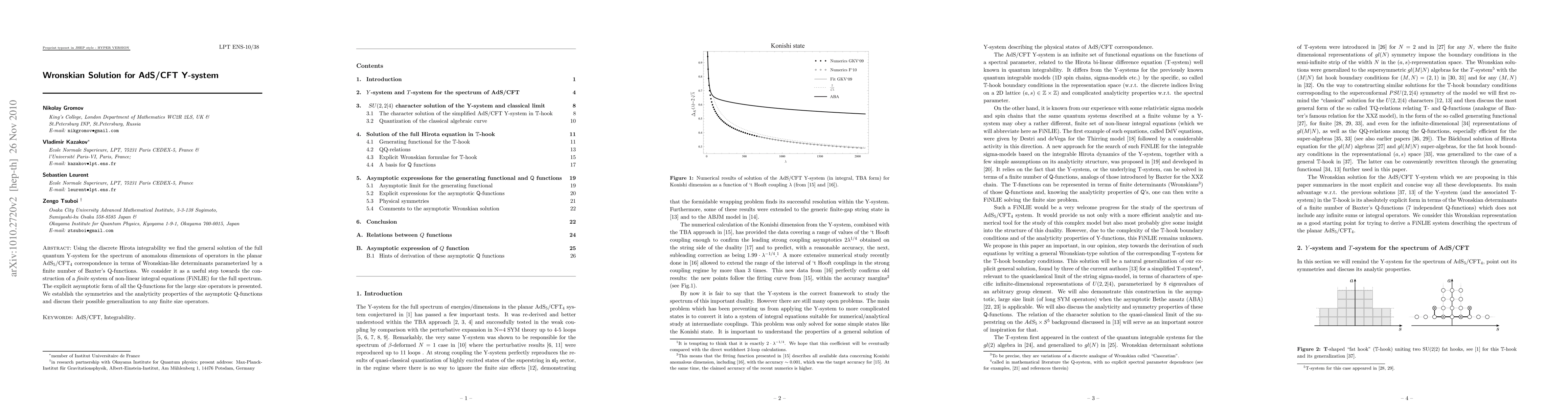 The paper finds the general solution for the quantum Y-system in AdS/CFT correspondence using discrete Hirota integrability, expressing it in terms of Wronskian-like determinants and Baxter's Q-functions. It also presents the asymptotic form and symmetries of these Q-functions for large operators, aiming towards constructing a finite system of non-linear integral equations for the full spectrum.