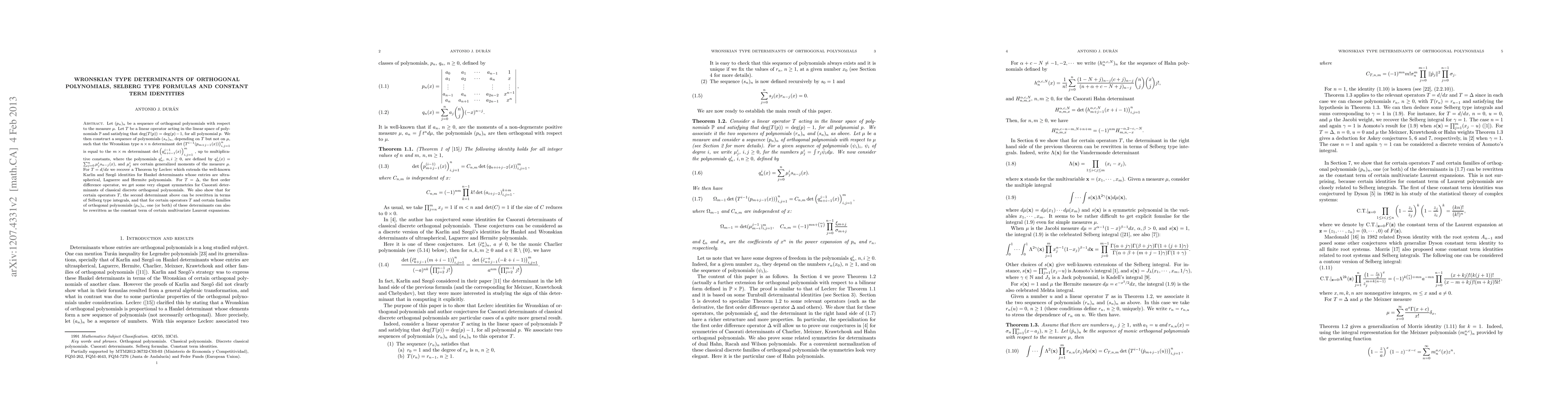 This paper constructs a sequence of polynomials $(s_n)_n$ from a linear operator $T$ acting on orthogonal polynomials $(p_n)_n$, establishing a determinant equivalence involving Wronskian type determinants and generalized moments. It extends classical identities and reveals symmetries for Casorati determinants, also linking these determinants to Selberg integrals and constant terms in multivariate Laurent expansions.