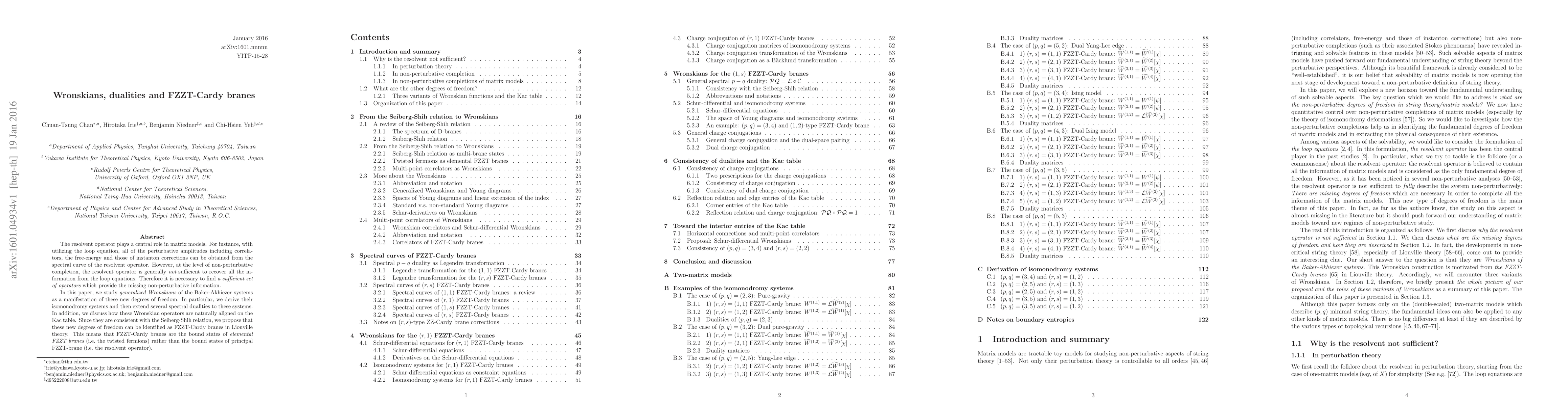 The resolvent operator plays a central role in matrix models. For instance, with utilizing the loop equation, all of the perturbative amplitudes including correlators, the free-energy and those of instanton corrections can be obtained from the spectral curve of the resolvent operator. However, at the level of non-perturbative completion, the resolvent operator is generally not sufficient to recover all the information from the loop equations. Therefore it is necessary to find a sufficient set of operators which provide the missing non-perturbative information. In this paper, we study generalized Wronskians of the Baker-Akhiezer systems as a manifestation of these new degrees of freedom. In particular, we derive their isomonodromy systems and then extend several spectral dualities to these systems. In addition, we discuss how these Wronskian operators are naturally aligned on the Kac table. Since they are consistent with the Seiberg-Shih relation, we propose that these new degrees of freedom can be identified as FZZT-Cardy branes in Liouville theory. This means that FZZT-Cardy branes are the bound states of elemental FZZT branes (i.e. the twisted fermions) rather than the bound states of principal FZZT-brane (i.e. the resolvent operator).