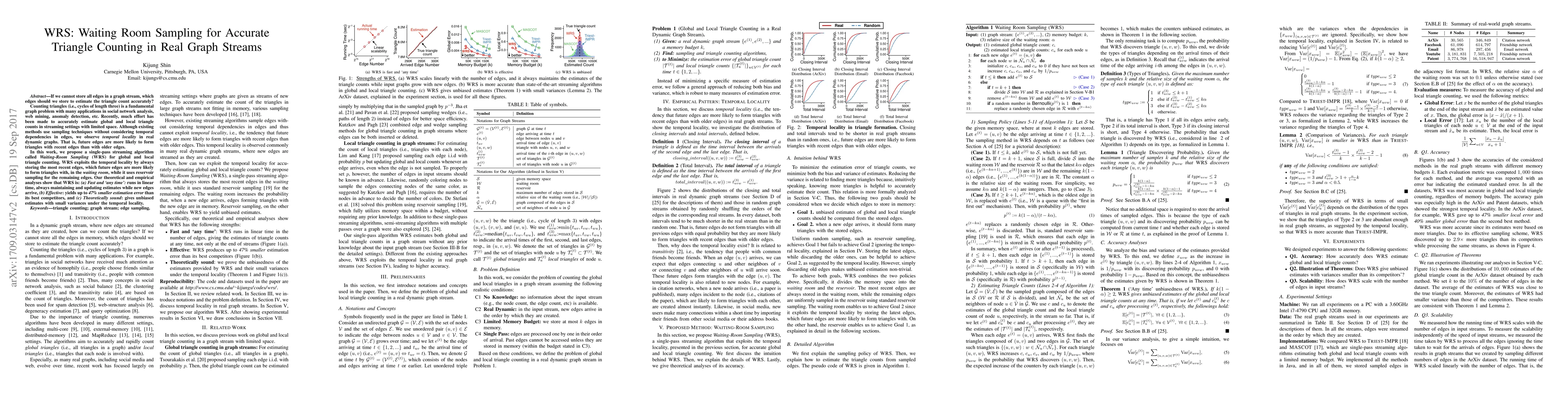 The paper proposes a Waiting-Room Sampling (WRS) algorithm for accurate triangle counting in graph streams, leveraging temporal locality to store recent edges likely to form triangles. WRS achieves fast, effective, and theoretically sound estimations with up to 47% smaller error compared to competitors.