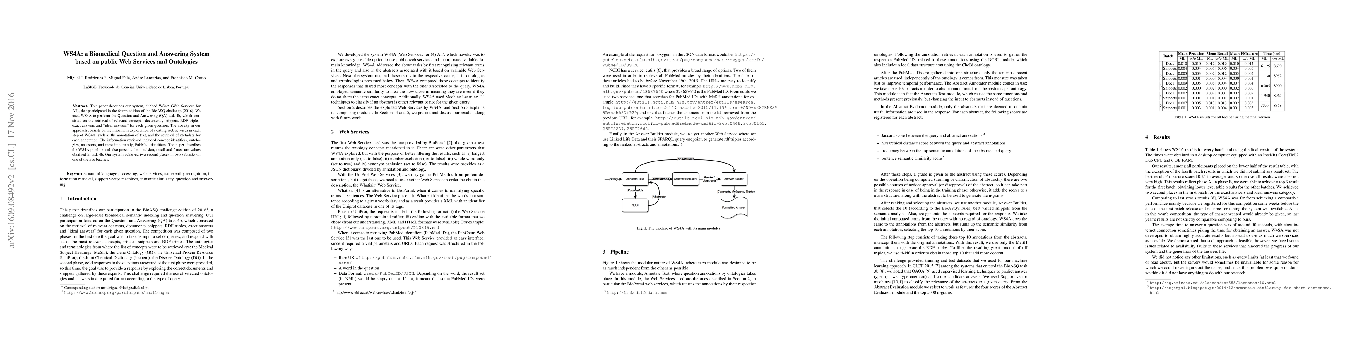 This paper describes our system, dubbed WS4A (Web Services for All), that participated in the fourth edition of the BioASQ challenge (2016). We used WS4A to perform the Question and Answering (QA) task 4b, which consisted on the retrieval of relevant concepts, documents, snippets, RDF triples, exact answers and ideal answers for each given question. The novelty in our approach consists on the maximum exploitation of existing web services in each step of WS4A, such as the annotation of text, and the retrieval of metadata for each annotation. The information retrieved included concept identifiers, ontologies, ancestors, and most importantly, PubMed identifiers. The paper describes the WS4A pipeline and also presents the precision, recall and f-measure values obtained in task 4b. Our system achieved two second places in two subtasks on one of the five batches.
