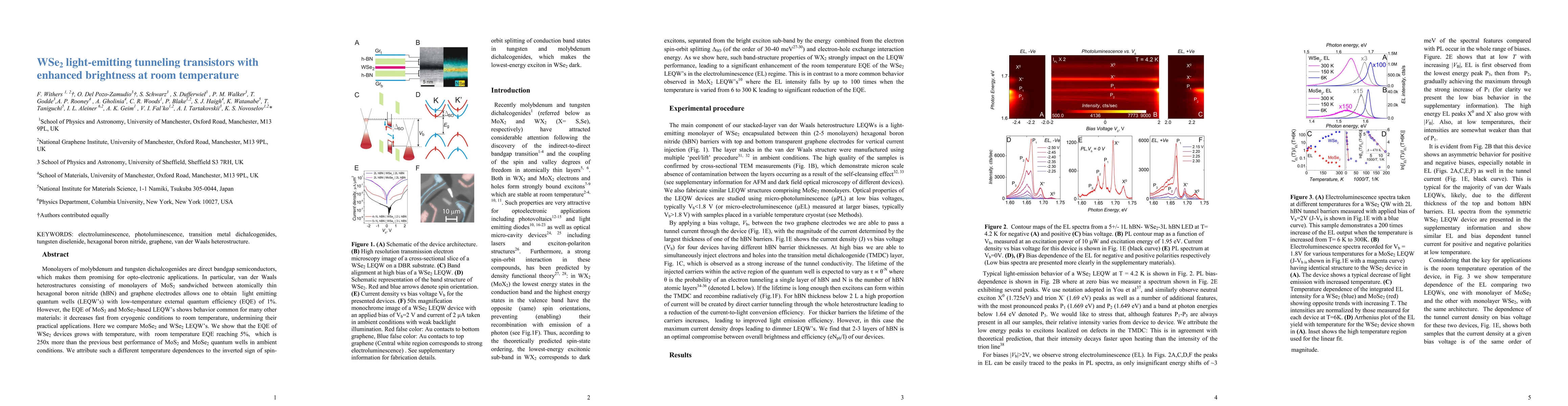 This paper investigates WSe2 light-emitting tunneling transistors, demonstrating that WSe2 outperforms MoS2 and MoSe2 in terms of external quantum efficiency (EQE) at room temperature, achieving 5% EQE compared to 0.02% for MoS2 and MoSe2. The enhanced performance is attributed to the inverted sign of spin-orbit splitting in tungsten dichalcogenides.