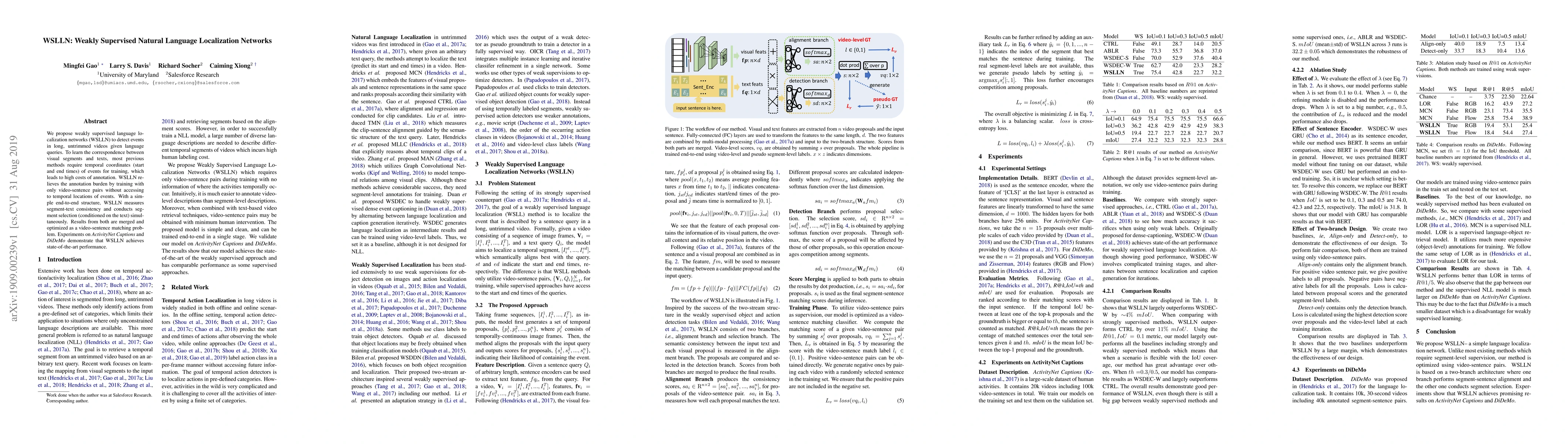 We propose weakly supervised language localization networks (WSLLN) to detect events in long, untrimmed videos given language queries. To learn the correspondence between visual segments and texts, most previous methods require temporal coordinates (start and end times) of events for training, which leads to high costs of annotation. WSLLN relieves the annotation burden by training with only video-sentence pairs without accessing to temporal locations of events. With a simple end-to-end structure, WSLLN measures segment-text consistency and conducts segment selection (conditioned on the text) simultaneously. Results from both are merged and optimized as a video-sentence matching problem. Experiments on ActivityNet Captions and DiDeMo demonstrate that WSLLN achieves state-of-the-art performance.