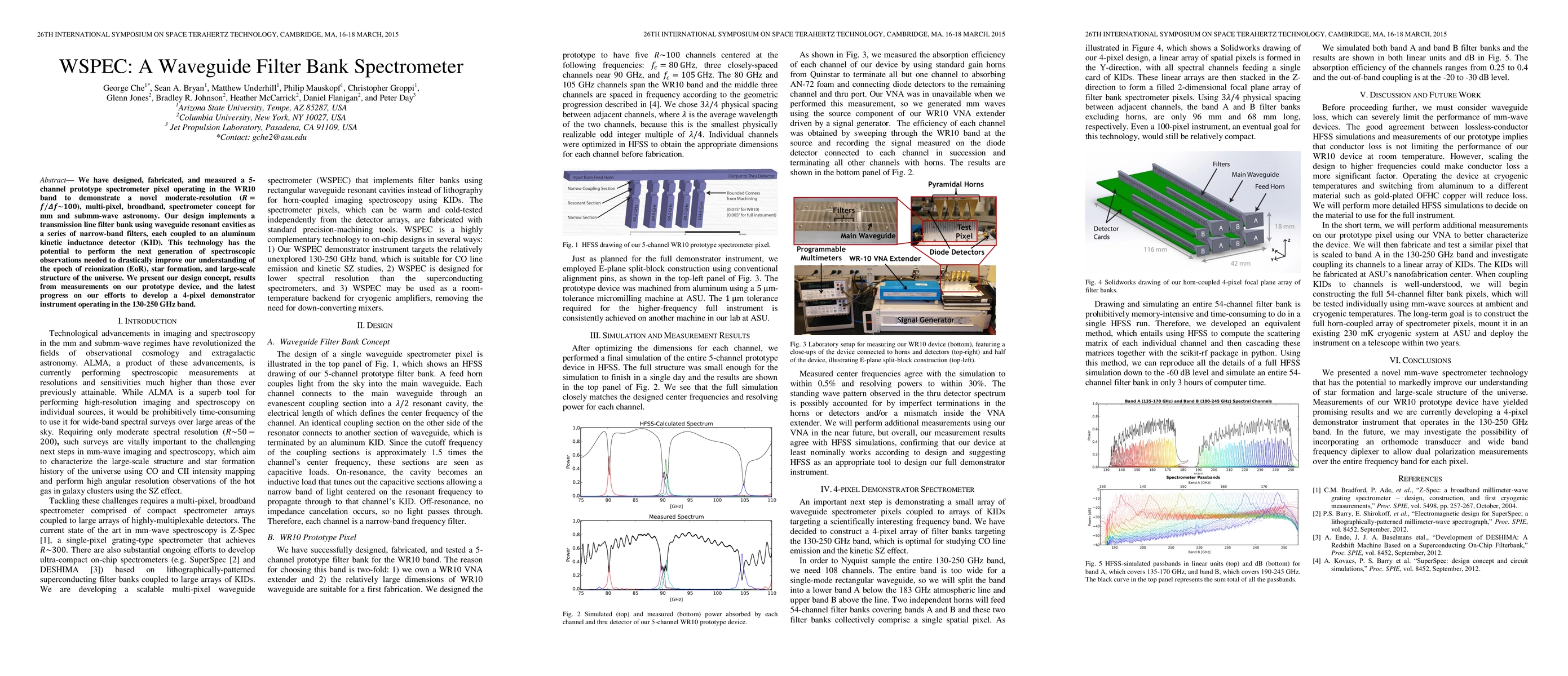 We have designed, fabricated, and measured a 5-channel prototype spectrometer pixel operating in the WR10 band to demonstrate a novel moderate-resolution (R=f/{\Delta}f~100), multi-pixel, broadband, spectrometer concept for mm and submm-wave astronomy. Our design implements a transmission line filter bank using waveguide resonant cavities as a series of narrow-band filters, each coupled to an aluminum kinetic inductance detector (KID). This technology has the potential to perform the next generation of spectroscopic observations needed to drastically improve our understanding of the epoch of reionization (EoR), star formation, and large-scale structure of the universe. We present our design concept, results from measurements on our prototype device, and the latest progress on our efforts to develop a 4-pixel demonstrator instrument operating in the 130-250 GHz band.