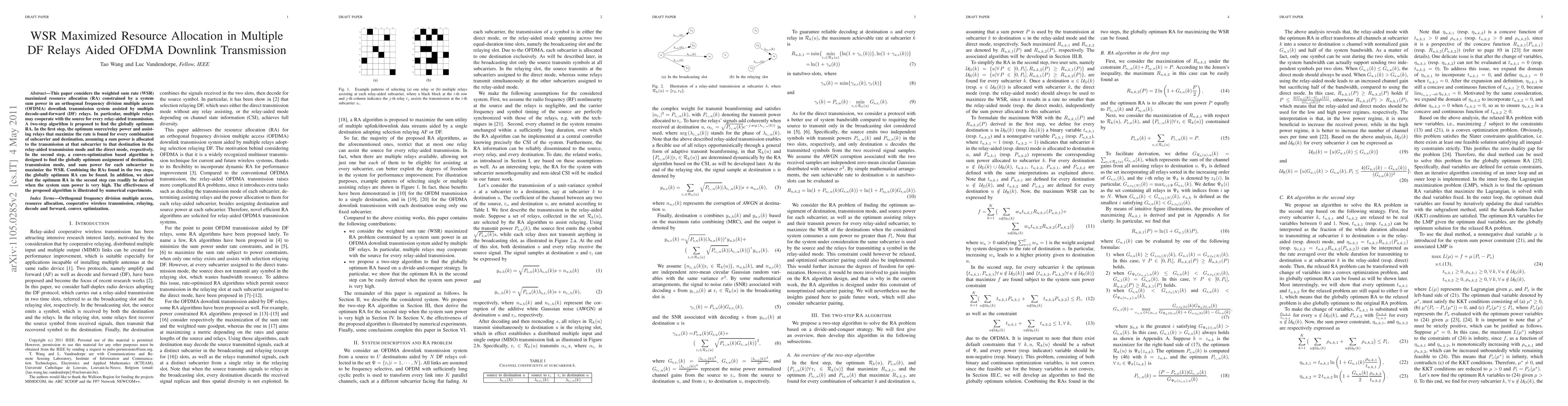 This paper proposes a two-step algorithm to maximize weighted sum rate (WSR) in OFDMA downlink transmissions with multiple DF relays, optimizing resource allocation under power constraints. The first step determines optimal power and relay selection, while the second step uses convex optimization to find the best assignment of destinations, transmission modes, and power for each subcarrier. Numerical experiments validate the algorithm's effectiveness.