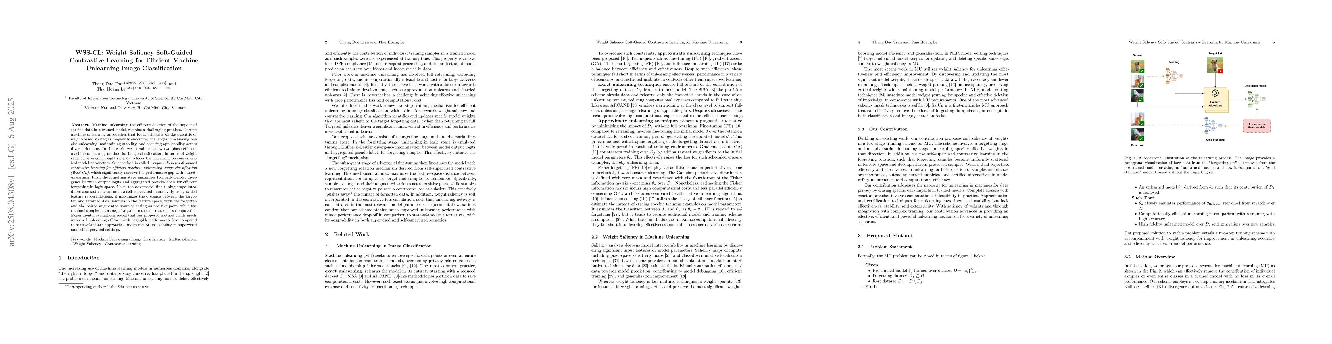 Machine unlearning, the efficient deletion of the impact of specific data in a trained model, remains a challenging problem. Current machine unlearning approaches that focus primarily on data-centric or weight-based strategies frequently encounter challenges in achieving precise unlearning, maintaining stability, and ensuring applicability across diverse domains. In this work, we introduce a new two-phase efficient machine unlearning method for image classification, in terms of weight saliency, leveraging weight saliency to focus the unlearning process on critical model parameters. Our method is called weight saliency soft-guided contrastive learning for efficient machine unlearning image classification (WSS-CL), which significantly narrows the performance gap with "exact" unlearning. First, the forgetting stage maximizes kullback-leibler divergence between output logits and aggregated pseudo-labels for efficient forgetting in logit space. Next, the adversarial fine-tuning stage introduces contrastive learning in a self-supervised manner. By using scaled feature representations, it maximizes the distance between the forgotten and retained data samples in the feature space, with the forgotten and the paired augmented samples acting as positive pairs, while the retained samples act as negative pairs in the contrastive loss computation. Experimental evaluations reveal that our proposed method yields much-improved unlearning efficacy with negligible performance loss compared to state-of-the-art approaches, indicative of its usability in supervised and self-supervised settings.