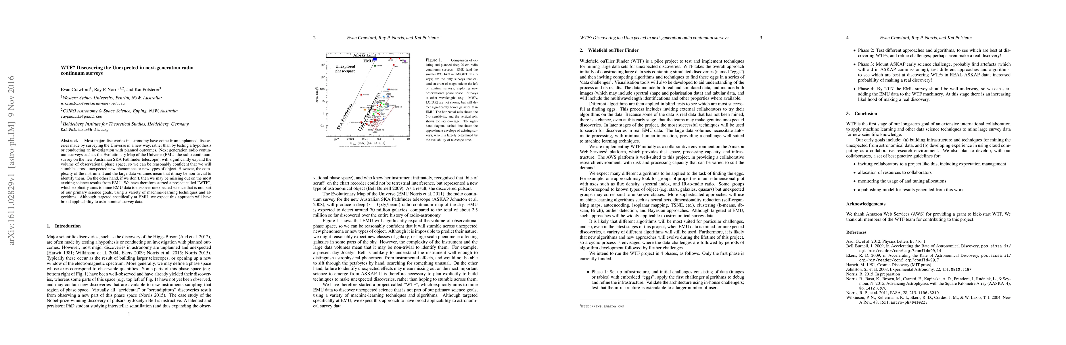 Most major discoveries in astronomy have come from unplanned discoveries made by surveying the Universe in a new way, rather than by testing a hypothesis or conducting an investigation with planned outcomes. Next generation radio continuum surveys such as the Evolutionary Map of the Universe (EMU: the radio continuum survey on the new Australian SKA Pathfinder telescope), will significantly expand the volume of observational phase space, so we can be reasonably confident that we will stumble across unexpected new phenomena or new types of object. However, the complexity of the instrument and the large data volumes mean that it may be non-trivial to identify them. On the other hand, if we don't, then we may be missing out on the most exciting science results from EMU. We have therefore started a project called "WTF", which explicitly aims to mine EMU data to discover unexpected science that is not part of our primary science goals, using a variety of machine-learning techniques and algorithms. Although targeted specifically at EMU, we expect this approach will have broad applicability to astronomical survey data.