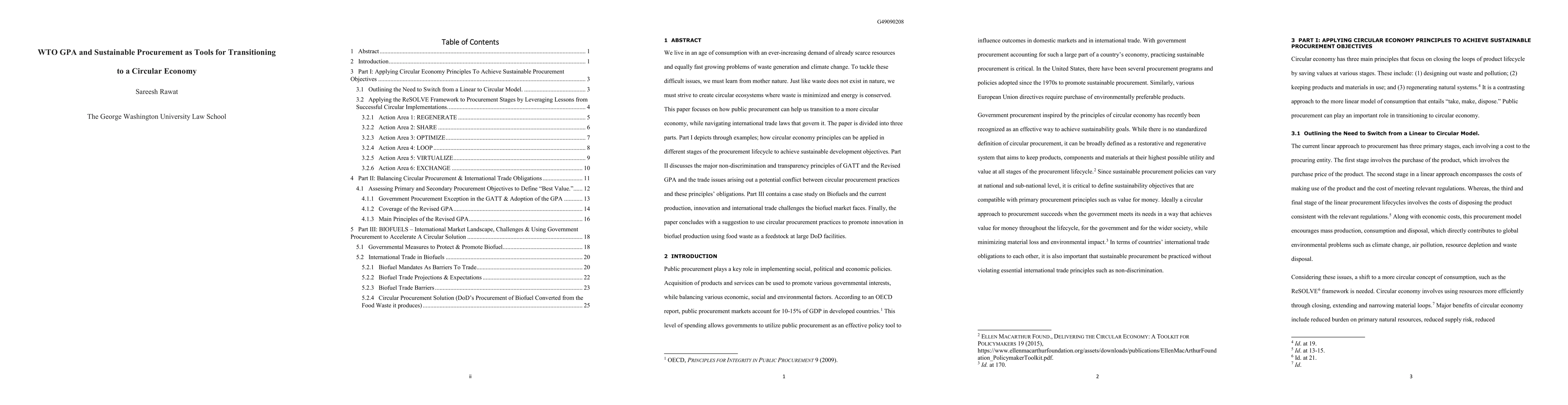 This paper explores how public procurement can help transition to a circular economy while navigating international trade laws, focusing on the role of WTO GPA and sustainable procurement in reducing waste and conserving energy.