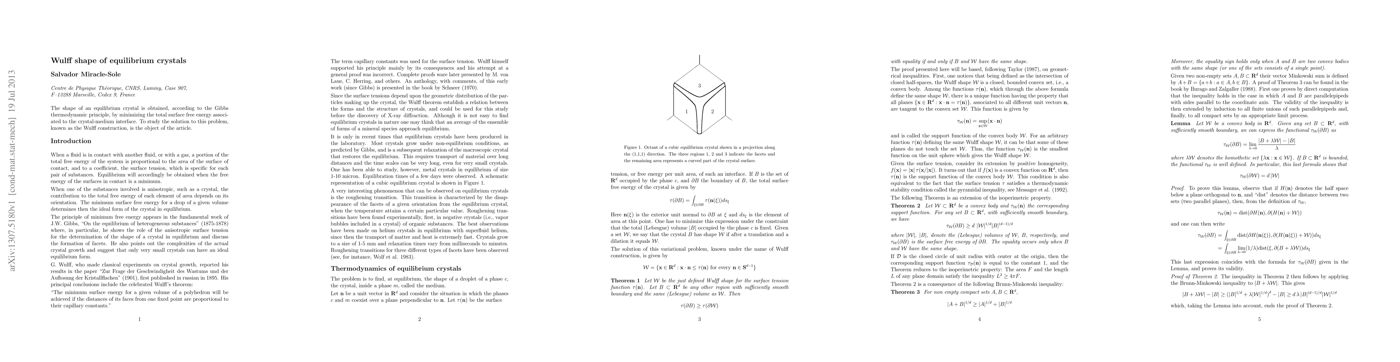 The shape of an equilibrium crystal is obtained, according to the Gibbs thermodynamic principle, by minimizing the total surface free energy associated to the crystal-medium interface. To study the solution to this problem, known as the Wulff construction, is the object of the article.
