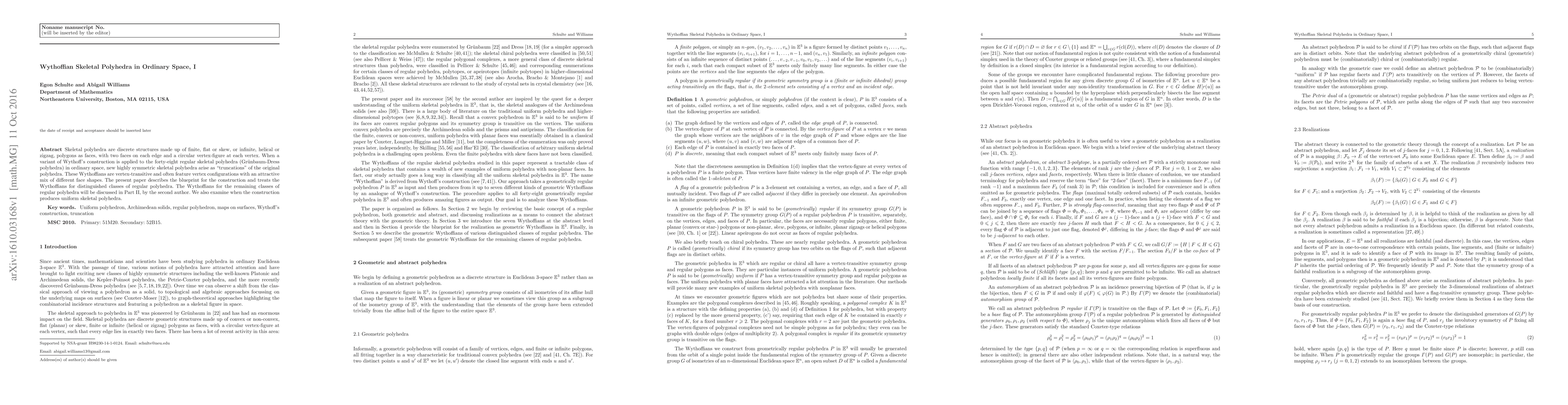 Skeletal polyhedra are discrete structures made up of finite, flat or skew, or infinite, helical or zigzag, polygons as faces, with two faces on each edge and a circular vertex-figure at each vertex. When a variant of Wythoff's construction is applied to the forty-eight regular skeletal polyhedra (Grunbaum-Dress polyhedra) in ordinary space, new highly symmetric skeletal polyhedra arise as "truncations" of the original polyhedra. These Wythoffians are vertex-transitive and often feature vertex configurations with an attractive mix of different face shapes. The present paper describes the blueprint for the construction and treats the Wythoffians for distinguished classes of regular polyhedra. The Wythoffians for the remaining classes of regular polyhedra will be discussed in Part II, by the second author. We also examine when the construction produces uniform skeletal polyhedra.