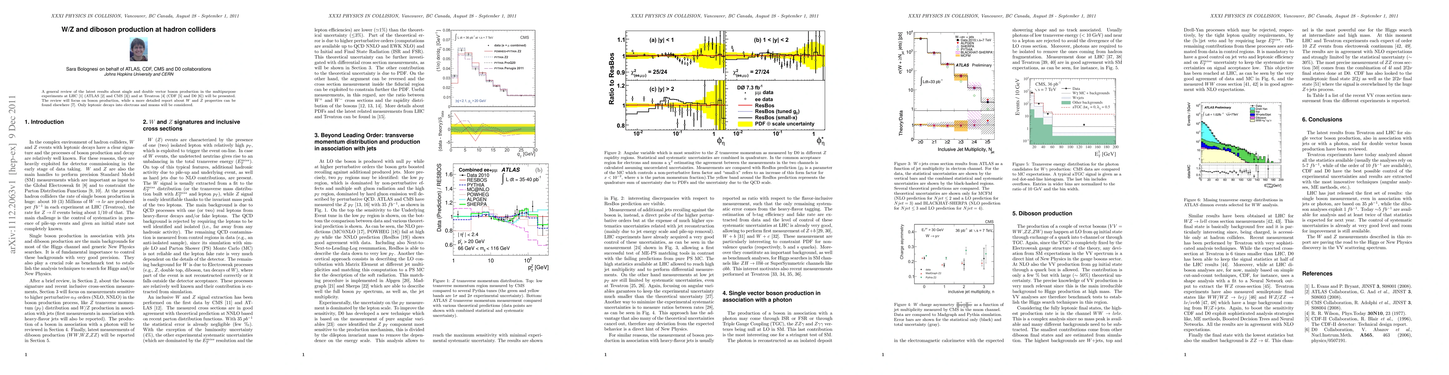 This paper reviews recent findings on W/Z and diboson production from experiments at the LHC (ATLAS and CMS) and Tevatron (CDF and D0), focusing on leptonic decays into electrons and muons. Detailed reports on W and Z properties are available separately.