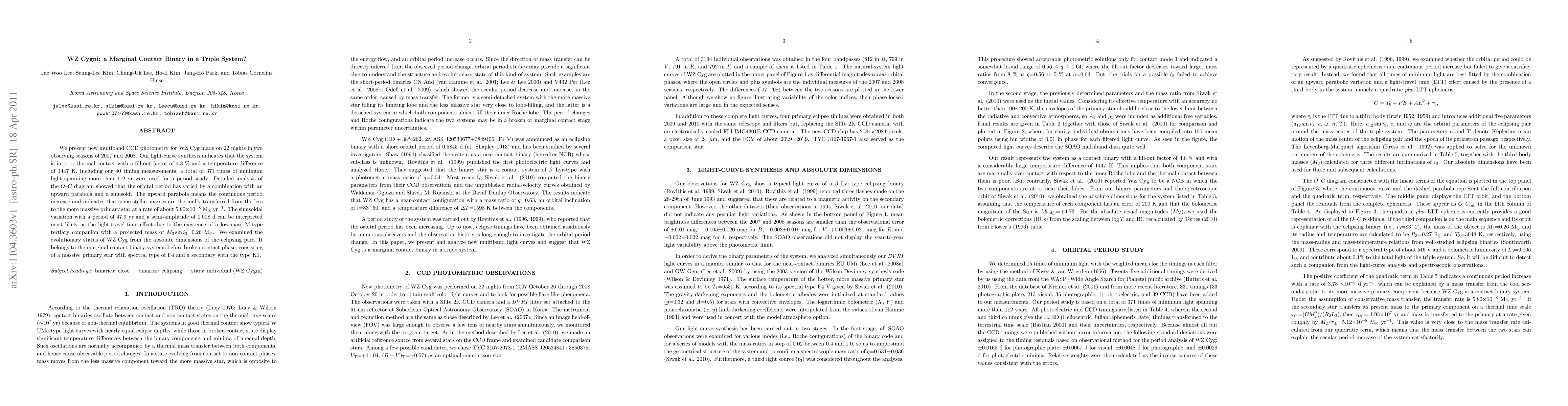 We present new multiband CCD photometry for WZ Cyg made on 22 nights in two observing seasons of 2007 and 2008. Our light-curve synthesis indicates that the system is in poor thermal contact with a fill-out factor of 4.8% and a temperature difference of 1447 K. Including our 40 timing measurements, a total of 371 times of minimum light spanning more than 112 yr were used for a period study. Detailed analysis of the $O$--$C$ diagram showed that the orbital period has varied by a combination with an upward parabola and a sinusoid. The upward parabola means the continuous period increase and indicates that some stellar masses are thermally transferred from the less to the more massive primary star at a rate of about 5.80$\times10^{-8}$ M$_\odot$ yr$^{-1}$. The sinusoidal variation with a period of 47.9 yr and a semi-amplitude of 0.008 d can be interpreted most likely as the light-travel-time effect due to the existence of a low-mass M-type tertiary companion with a projected mass of $M_3 \sin i_3$=0.26 M$_\odot$. We examined the evolutionary status of WZ Cyg from the absolute dimensions of the eclipsing pair. It belongs to the marginal contact binary systems before broken-contact phase, consisting of a massive primary star with spectral type of F4 and a secondary with the type K1.
