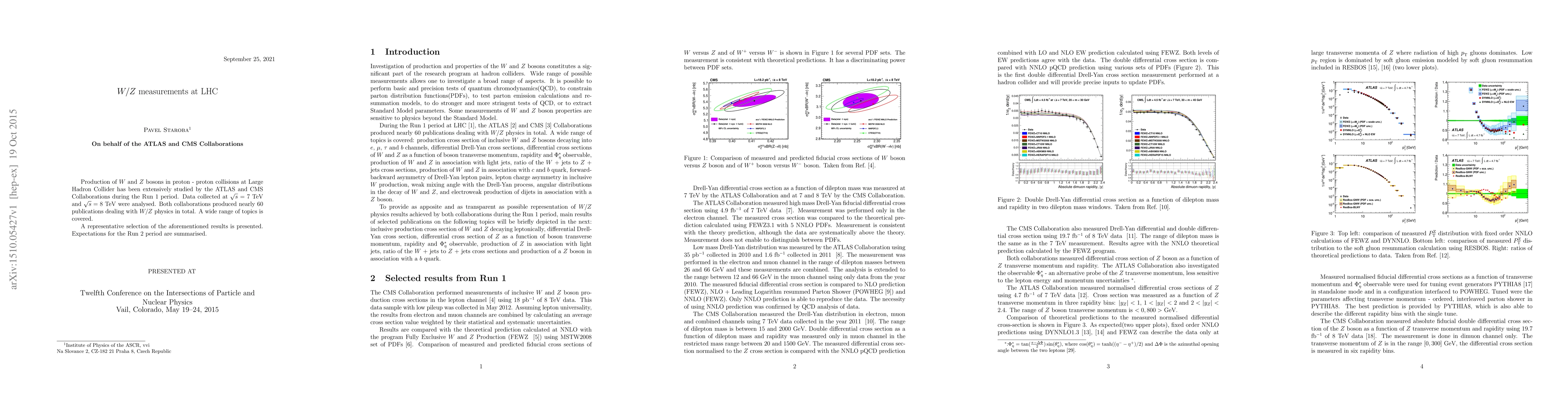 Production of W and Z bosons in proton - proton collisions at Large Hadron Collider has been extensively studied by the ATLAS and CMS Collaborations during the Run 1 period. Data collected at $\sqrt s$ = 7 TeV and $\sqrt s$ = 8 TeV were analysed. Both collaborations produced nearly 60 publications dealing with W/Z physics in total. A wide range of topics is covered. A representative selection of the aforementioned results is presented. Expectations for the Run 2 period are summarised.