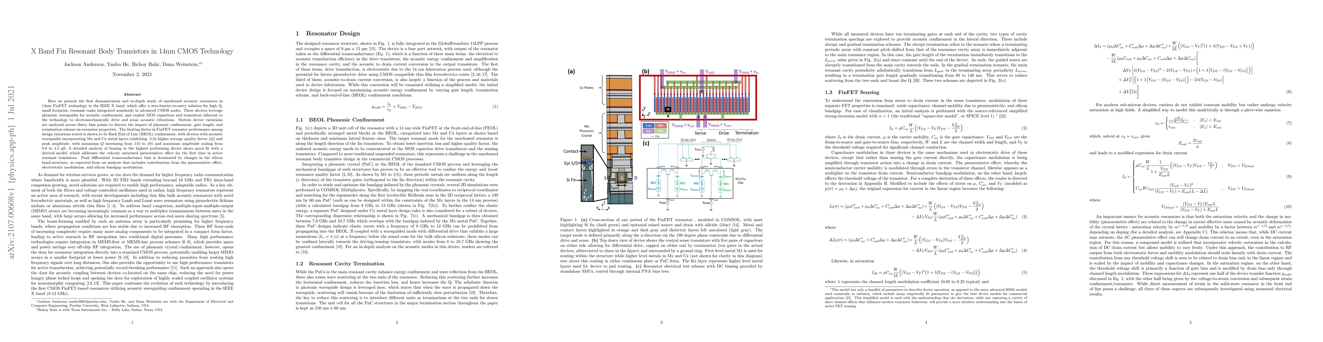 Here we present the first demonstration and in-depth study of unreleased acoustic resonators in 14nm FinFET technology in the IEEE X band, which offer a zero-barrier-to-entry solution for high Q, small footprint, resonant tanks integrated seamlessly in advanced CMOS nodes. These devices leverage phononic waveguides for acoustic confinement, and exploit MOS capacitors and transistors inherent to the technology to electromechanically drive and sense acoustic vibrations. Sixteen device variations are analyzed across thirty bias points to discern the impact of phononic confinement, gate length, and termination scheme on resonator properties. The limiting factor in FinFET resonator performance among design variations tested is shown to be Back End of Line (BEOL) confinement, with devices with acoustic waveguides incorporating Mx and Cx metal layers exhibiting 2.2x higher average quality factor (Q) and peak amplitude, with maximum Q increasing from 115 to 181 and maximum amplitude scaling from 0.8 to 4.5 uS. A detailed analysis of biasing in the highest performing device shows good fit with a derived model, which addresses the velocity saturated piezoresistive effect for the first time in active resonant transistors. Peak differential transconductance that is dominated by changes in the silicon band-structure, as expected from an analysis that includes contributions from the piezoresistive effect, electrostatic modulation, and silicon bandgap modulation.