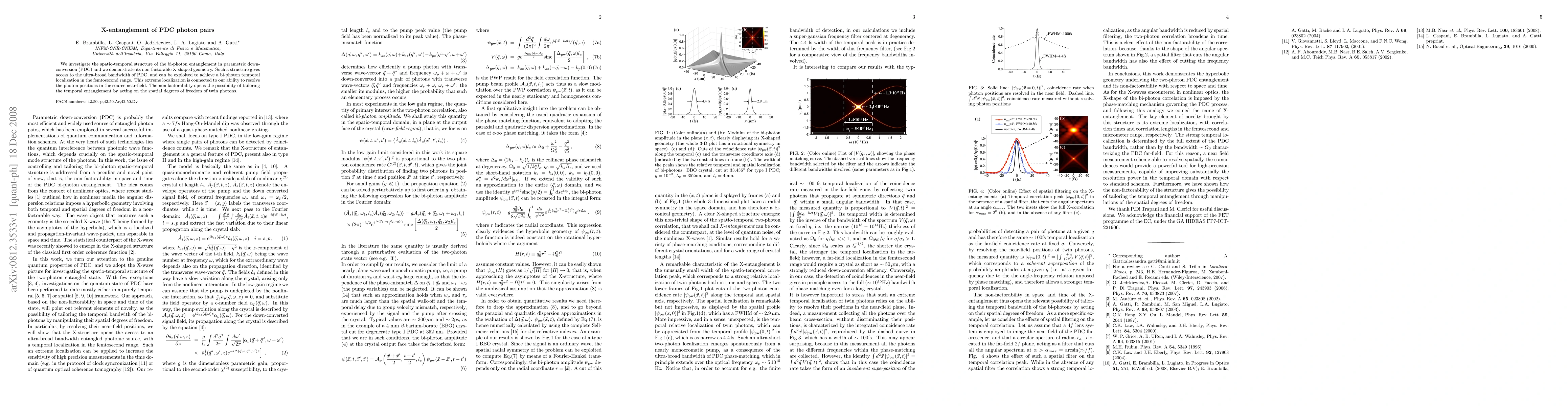 This paper explores the spatial and temporal characteristics of bi-photon entanglement in parametric down-conversion, revealing a non-factorable X-shaped geometry that enables ultra-broad bandwidth and femtosecond-range temporal localization. The study highlights the potential to manipulate temporal entanglement through spatial degrees of freedom.