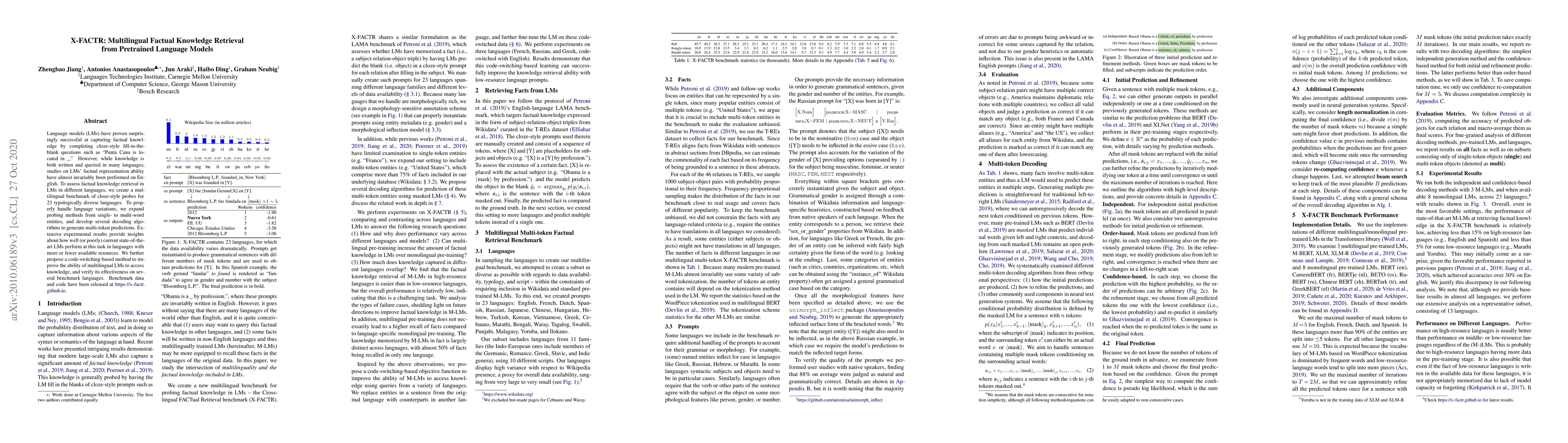 The paper introduces X-FACTR, a multilingual benchmark for evaluating factual knowledge retrieval in pretrained language models across 23 languages. It proposes methods to handle multilingual variations and assesses the performance of current models, proposing a code-switching technique to enhance multilingual knowledge access.