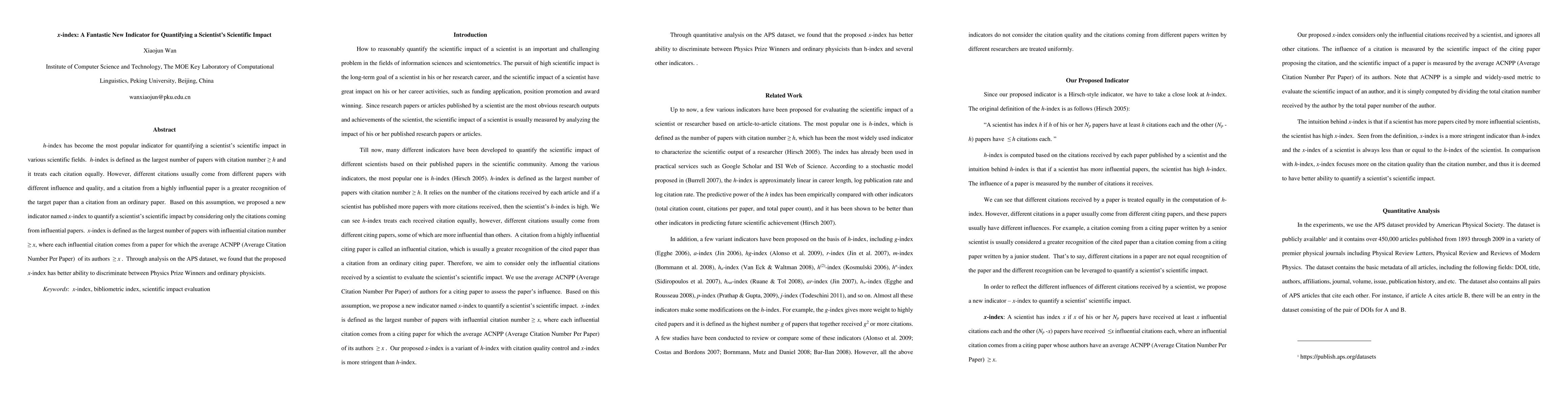 The paper proposes the x-index as a new metric to quantify a scientist's impact, focusing on citations from highly influential papers rather than treating all citations equally. The x-index better discriminates between Physics Prize Winners and ordinary physicists compared to the h-index, according to analysis on the APS dataset.