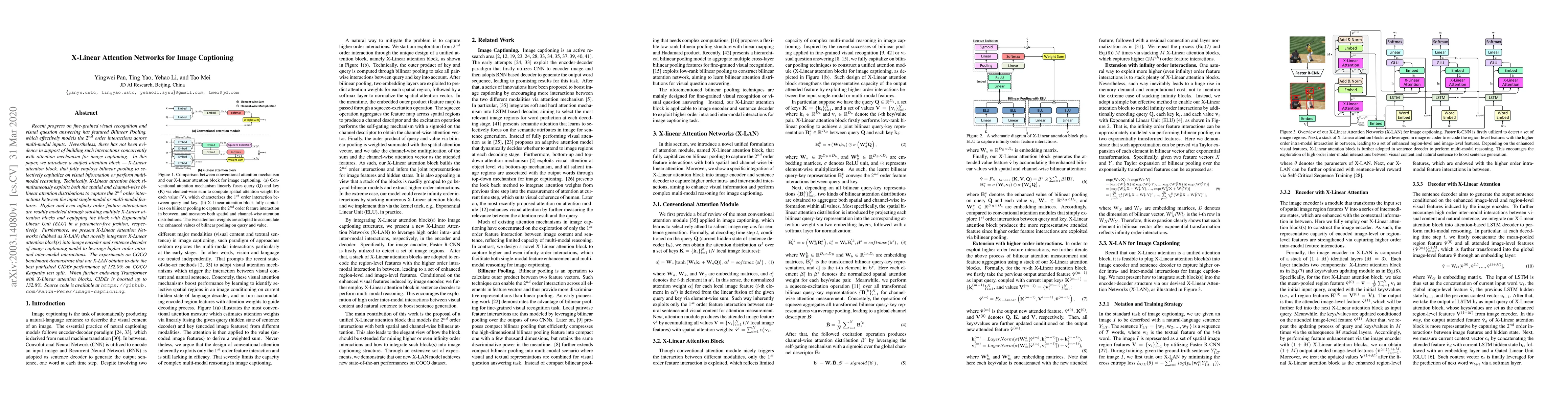 This paper introduces X-Linear attention networks (X-LAN) for image captioning, utilizing an X-Linear attention block that employs bilinear pooling to model higher-order interactions between visual and textual features. Experiments on the COCO dataset show that X-LAN achieves state-of-the-art performance, with an improvement in CIDEr score to 132.8% when integrated with Transformer.