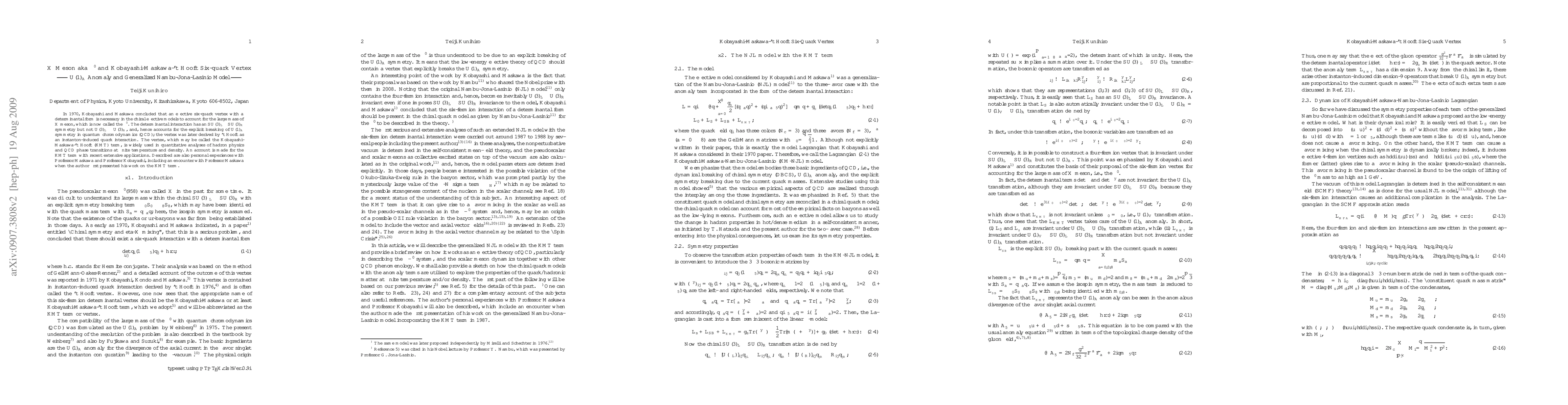 This paper discusses the Kobayashi-Maskawa-'t Hooft (KMT) six-quark vertex, essential for explaining the large mass of the $X$ meson ($\eta'$). It highlights the $U(1)_A$ anomaly and its role in quantum chromodynamics (QCD), emphasizing the KMT term's significance in hadron physics and QCD phase transitions.