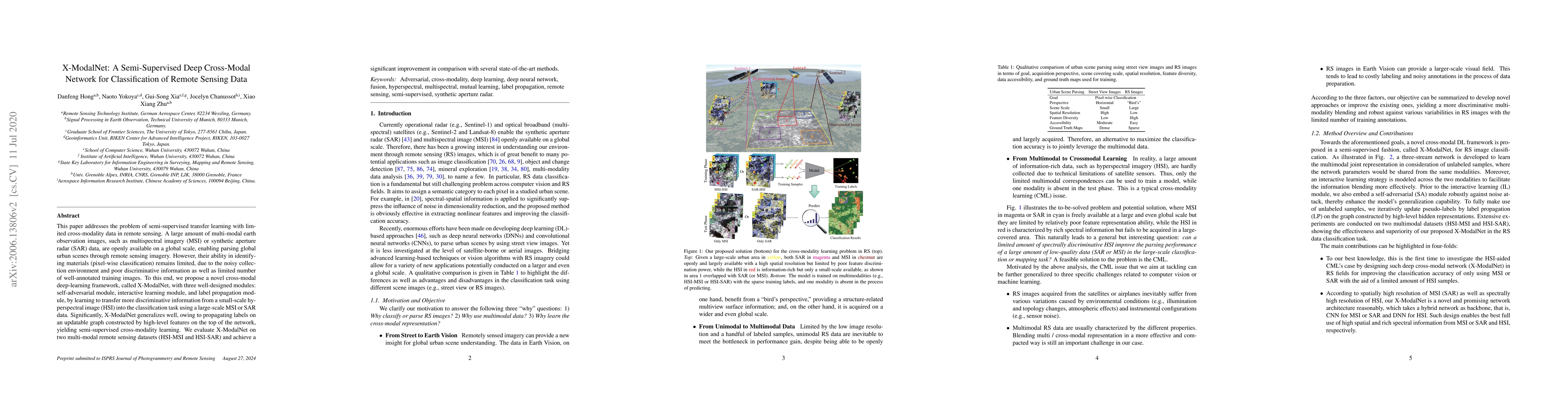 X-ModalNet is a semi-supervised deep learning framework designed to enhance the classification of remote sensing data using limited cross-modality training samples. It achieves significant improvements through self-adversarial, interactive learning, and label propagation modules, demonstrating superior performance on multi-modal datasets.