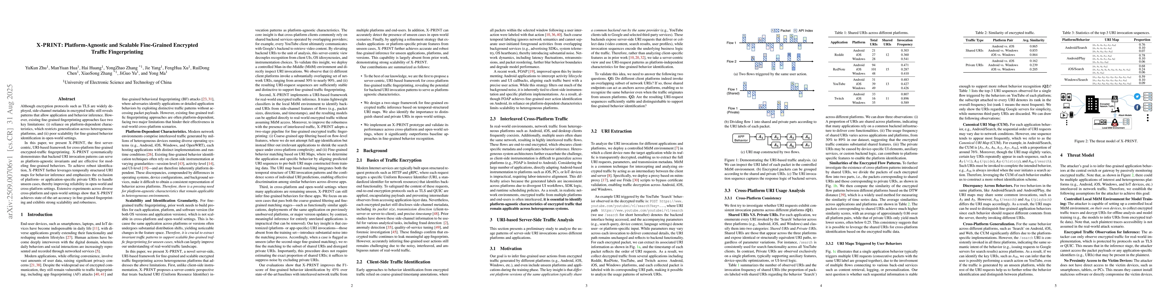 Although encryption protocols such as TLS are widely de-ployed,side-channel metadata in encrypted traffic still reveals patterns that allow application and behavior inference.How-ever,existing fine-grained fingerprinting approaches face two key limitations:(i)reliance on platform-dependent charac-teristics,which restricts generalization across heterogeneous platforms,and(ii)poor scalability for fine-grained behavior identification in open-world settings. In this paper,we present X-PRINT,the first server-centric,URI-based framework for cross-platform fine-grained encrypted-traffic fingerprinting.X-PRINT systematically demonstrates that backend URI invocation patterns can serve as platform-agnostic invariants and are effective for mod-eling fine-grained behaviors.To achieve robust identifica-tion,X-PRINT further leverages temporally structured URI maps for behavior inference and emphasizes the exclusion of platform-or application-specific private URIs to handle unseen cases,thereby improving reliability in open-world and cross-platform settings.Extensive experiments across diverse cross-platform and open-world settings show that X-PRINT achieves state-of-the-art accuracy in fine-grained fingerprint-ing and exhibits strong scalability and robustness.